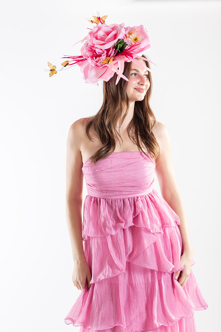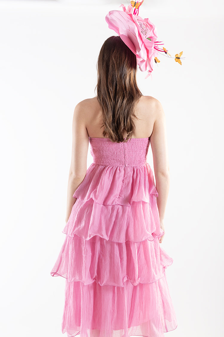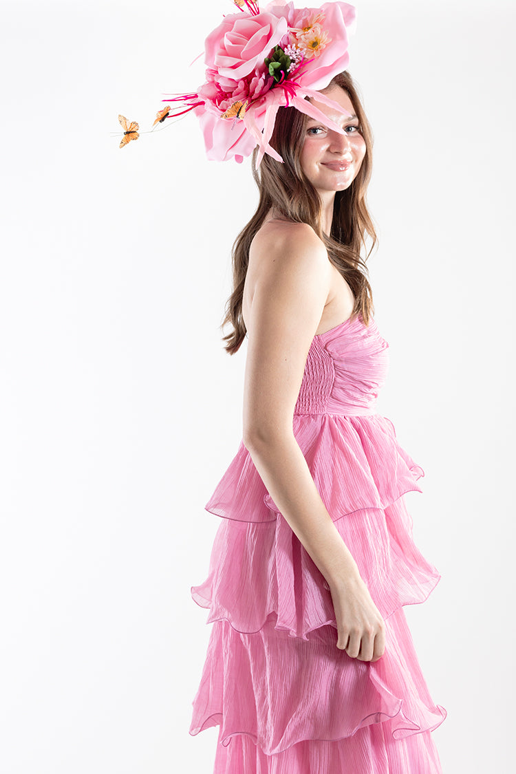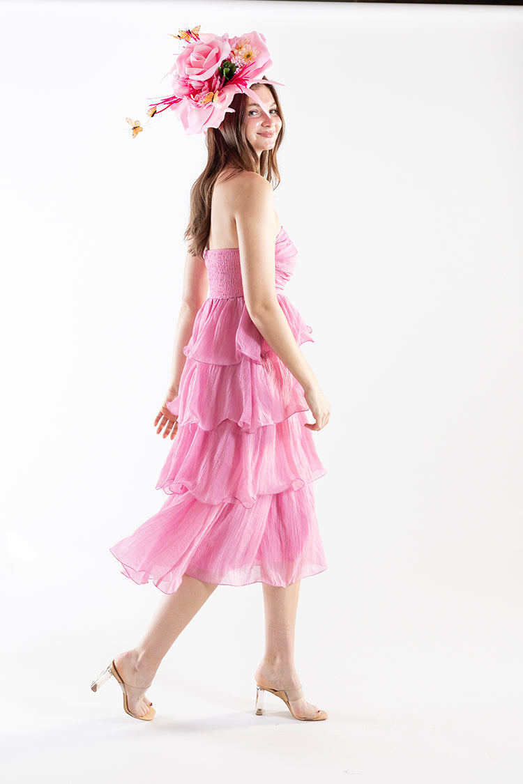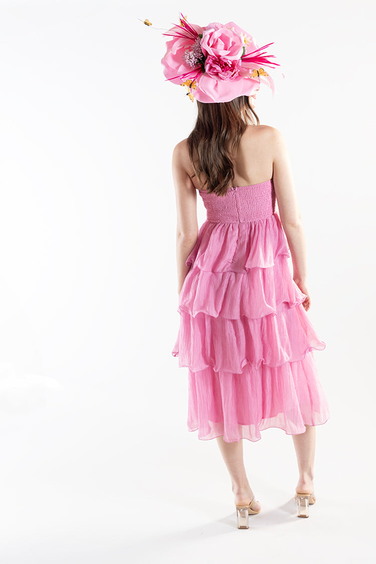 Playful, feminine, and effortlessly eye-catching, this strapless midi dress is a total party. Designed with a softly ruched bodice and cascading tiered ruffles, it creates beautiful movement and an airy, flattering silhouette. The vibrant pink hue adds a bold pop of color while the lightweight fabric keeps it breezy and comfortable. It’s the kind of dress that feels made for Derby days—perfect for garden parties, spring events, or any moment that calls for something a little celebratory.