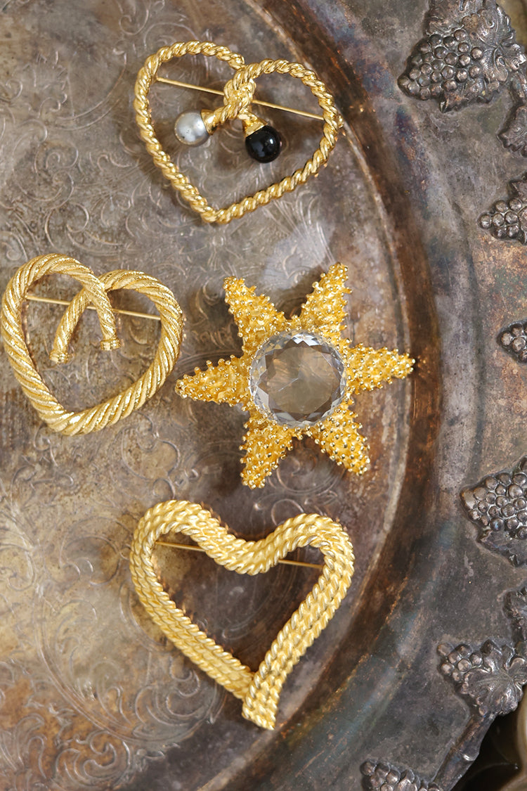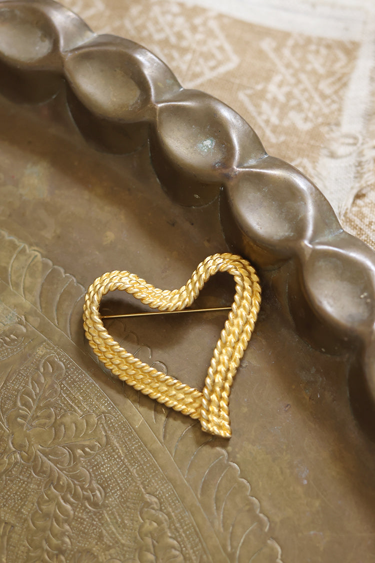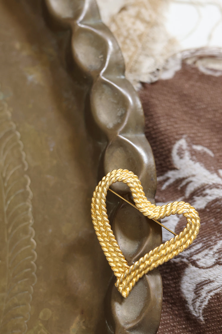 A softly braided texture gives this vintage heart brooch its warm, dimensional appeal. Crafted in gold-tone metal, the woven design adds depth while maintaining a graceful, open silhouette. The heart shape feels classic yet relaxed, making it easy to style with both casual and dressed-up looks.
