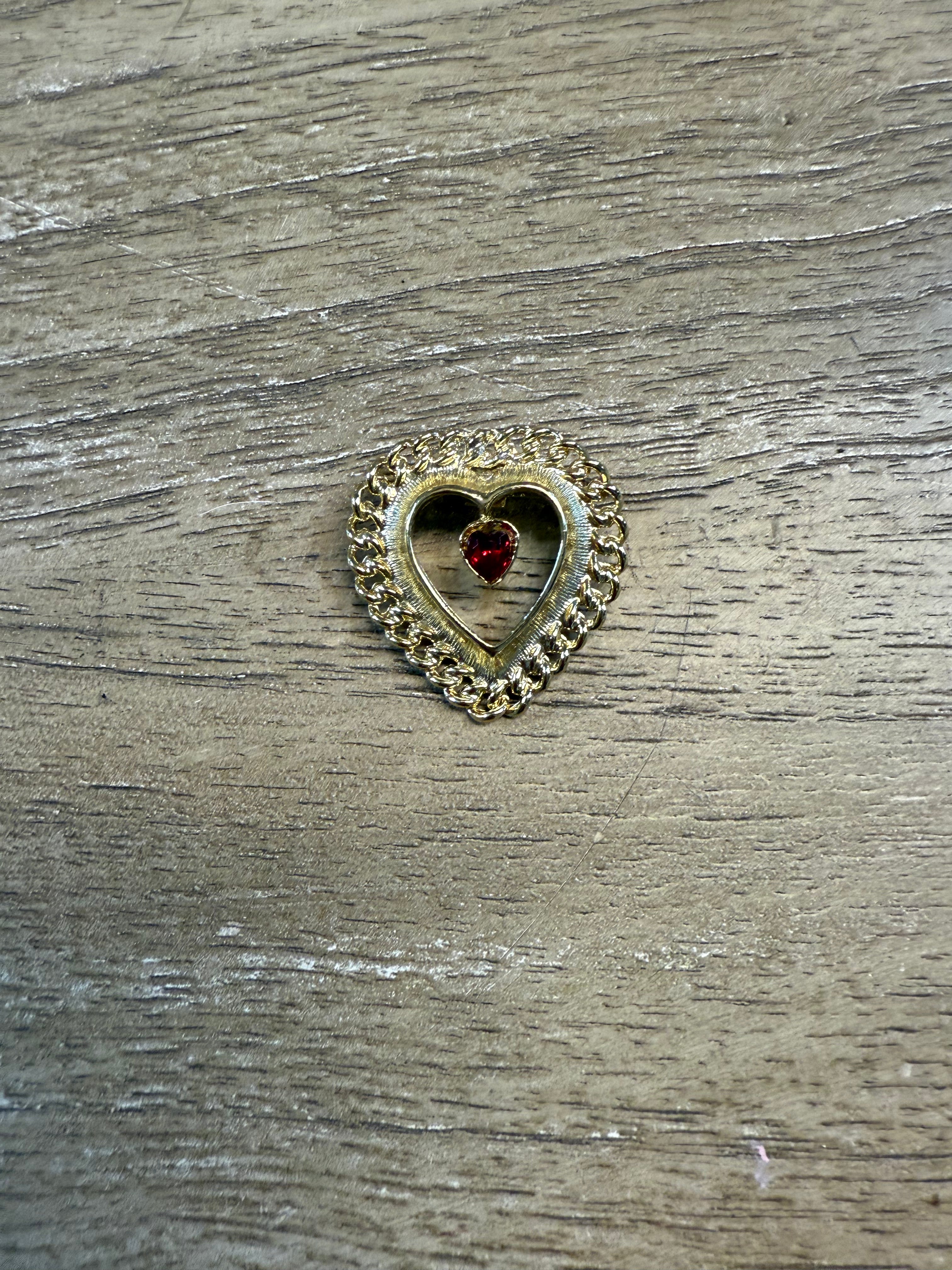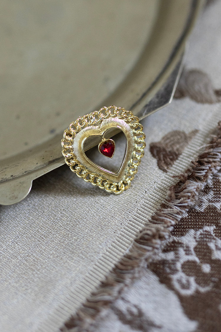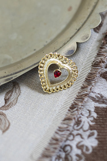 Framed by a cool chain-link border, this gold heart brooch's deep red heart-shaped center stone adds warmth and contrast. The combination of texture and color gives this piece a bold yet romantic presence. A striking accent that brings a hint of sentiment and vintage charm to any outfit.