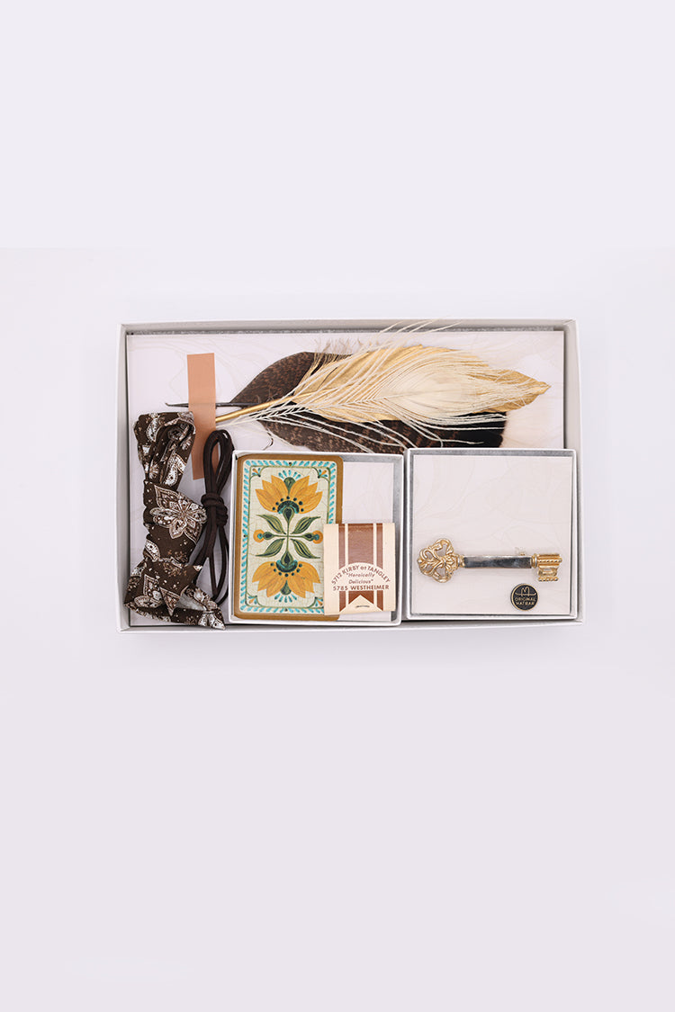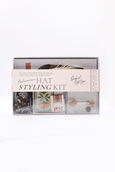 The bohemian kit has free-spirit vibes combining vibrant colors, natural materials and global influences that foster eclectic, layered hats. This kit includes a vintage gold key brooch and floral playing card.