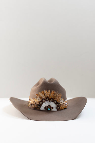 Bring bold Western flair to your favorite wide brim with this eye-catching feather hat band. Designed with layered natural feathers in warm browns and soft whites, it fans out beautifully for a striking, handcrafted look. A small turquoise accent at the center adds the perfect pop of color and a touch of Southwestern style. Easy to secure around a variety of hat shapes, this standout accessory instantly elevates any hat with texture, artistry and personality. A must-have detail for anyone who loves a little extra wow in their hat stack.
