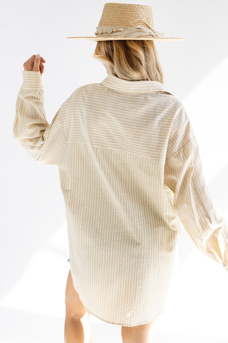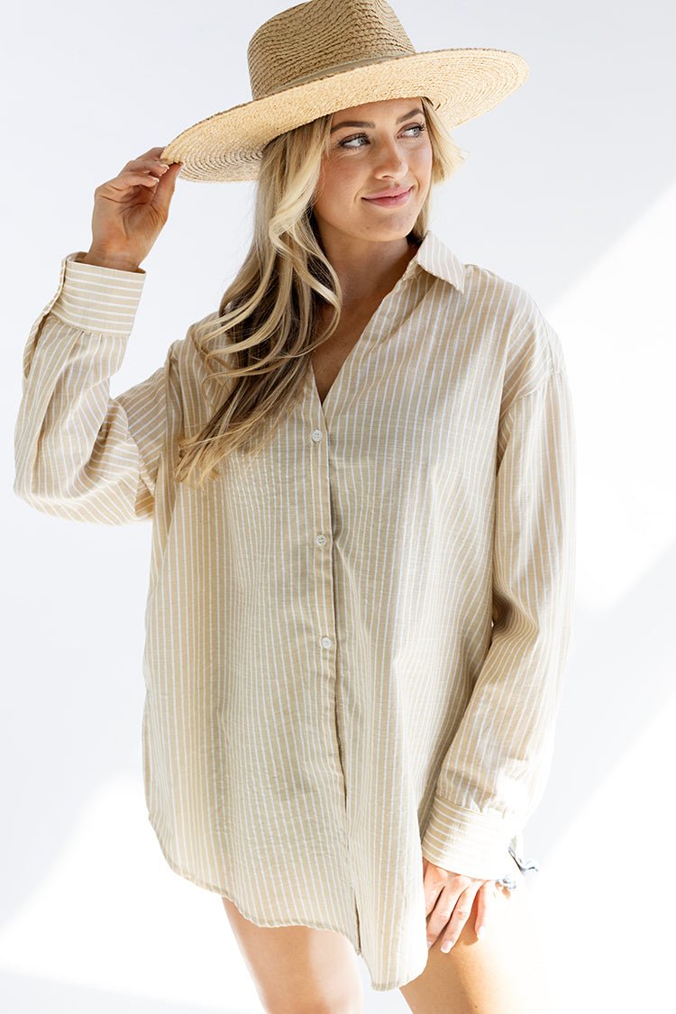 File this stripe top under essential blouses. The neutral color, simple print and classic silhouette make this piece easy to wear everyday. Pair with any color denim for a casual look or with slacks or a full skirt for an elevated twist.