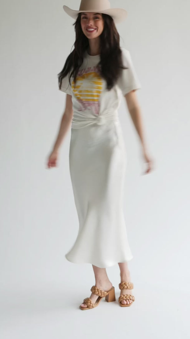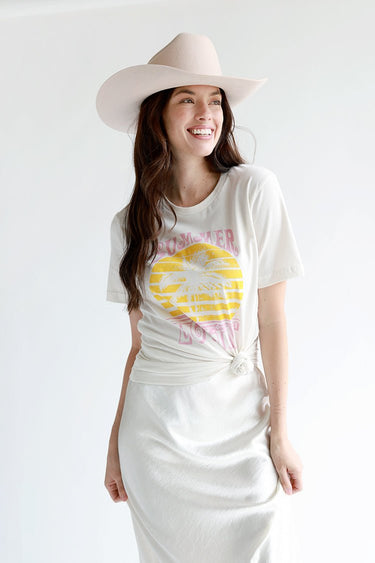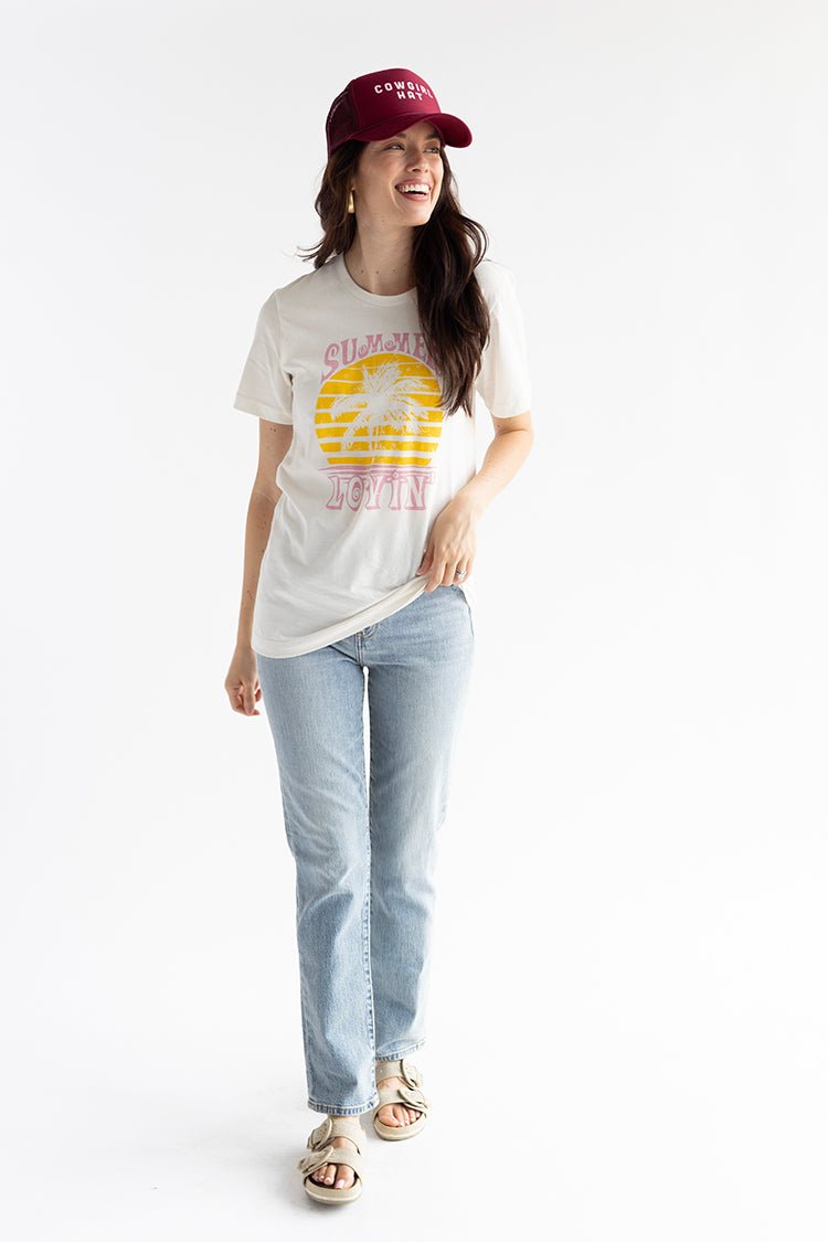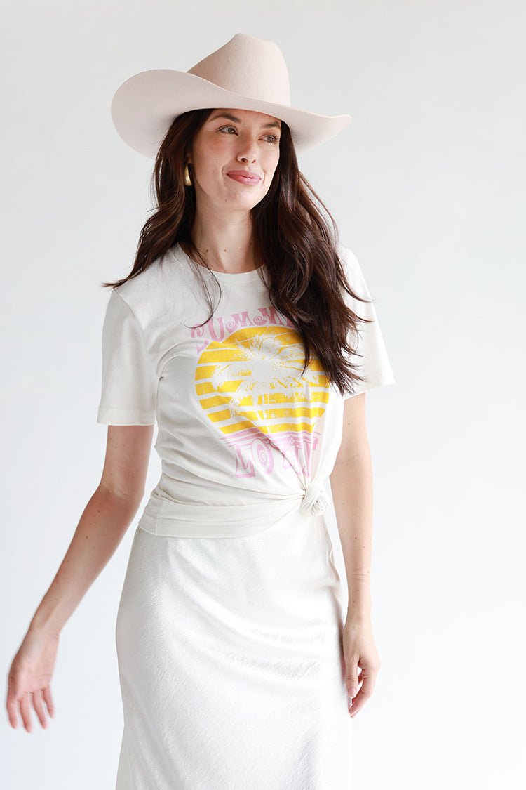 Meet the tee of the season! Show your summer love with this happy graphic tee that pairs with denim or satin all day long.