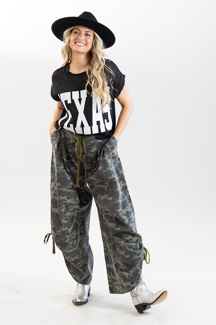 Show your Texas pride in this black, ribbed, knit t-shirt that's perfect for game day or weekend outings. Style with denim, a pleated miniskirt or wide leg pants.