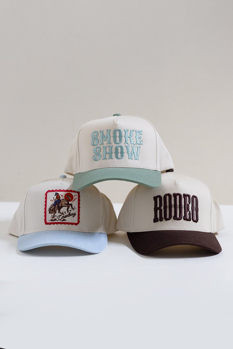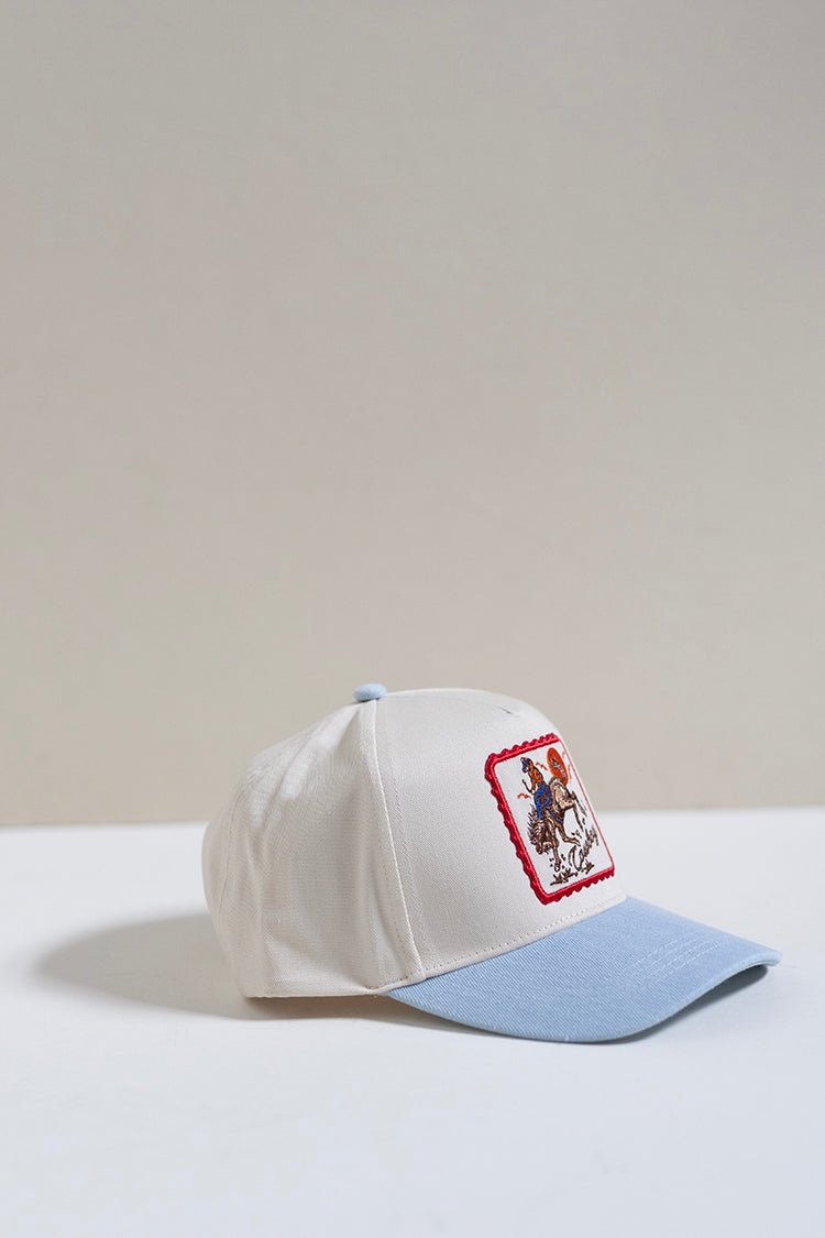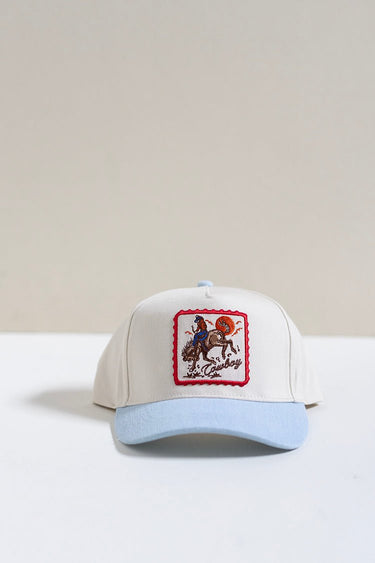 Our denim western patch trucker hat is your new go-to for repping rodeo roots with a splash of retro flair. Featuring a cream crown with a vintage-inspired cowboy patch and a soft denim blue brim, this two-tone trucker hat blends western charm with everyday cool. The structured fit and curved bill keep things classic, while the adjustable snapback ensures a comfy, customizable wear. Whether you're two-steppin’ at the dance hall or soaking up the sun at a summer fair, this hat is made to top off your outfit with personality and punch.
