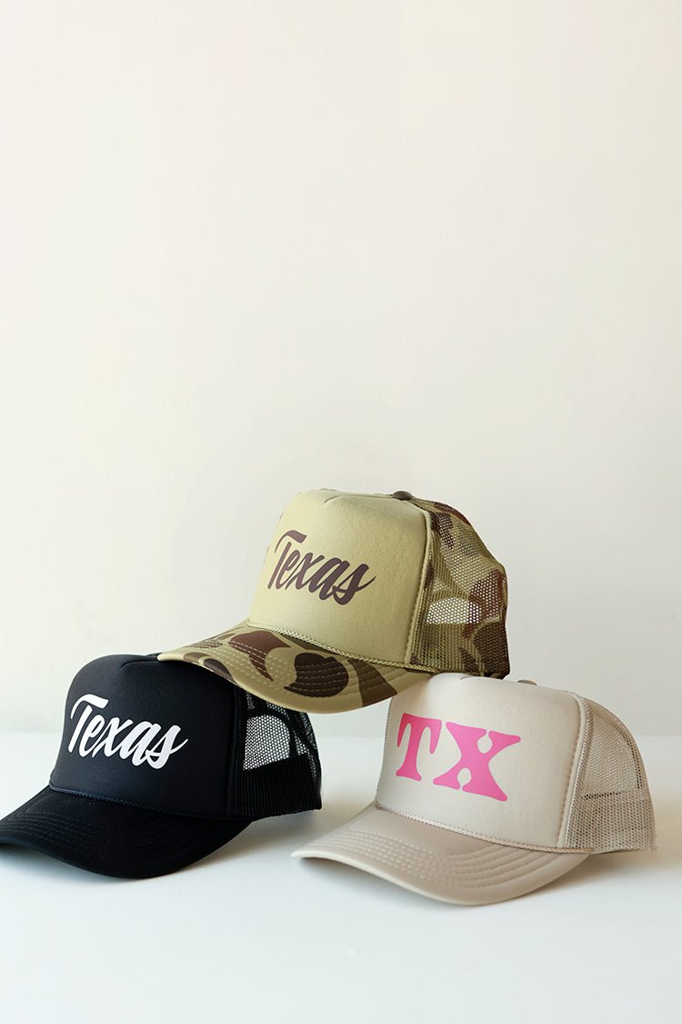 Show your Texas love with our exclusive "TX" bold font trucker hat! All of our trucker hats are designed in-house and vinyled by a small business in Prosper, Texas.