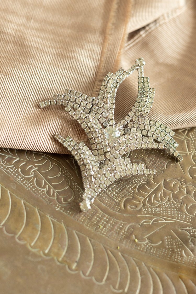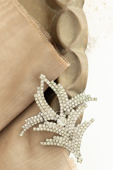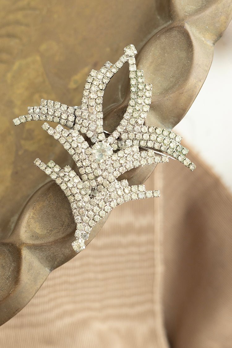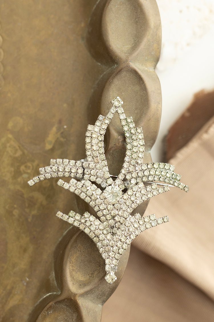 This dazzling Art Deco-style brooch captures the glamour and geometric elegance of the Roaring Twenties. Crafted with intricate detailing, it features a bold design that combines vintage flair with modern sophistication. The brooch's sparkling rhinestones are set against a backdrop of sleek metalwork, creating a striking contrast that draws the eye. Sourced from Long Beach, California, it embodies the timeless appeal of vintage costume jewelry. Perfect for collectors and fashion enthusiasts alike, this brooch is a must-have accessory for those seeking to infuse their wardrobe with a dash of retro glamour.