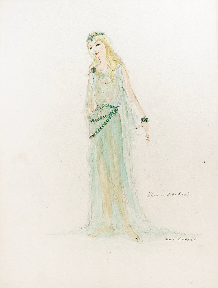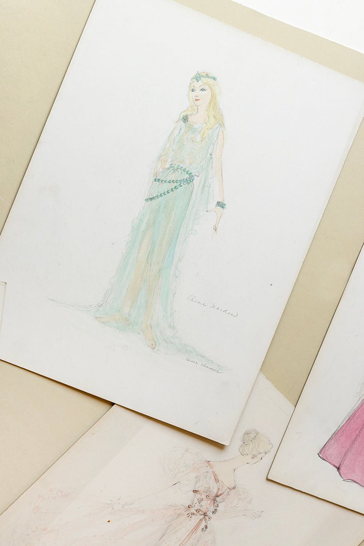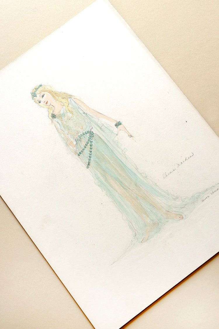 This Rhine Maiden pencil and watercolor sketch is simply beautiful with its soft tones and a dreamy dress design. Frame this fairy tale work solo or pair with another whimsical character from this vintage art series we recently scored in Southern California.