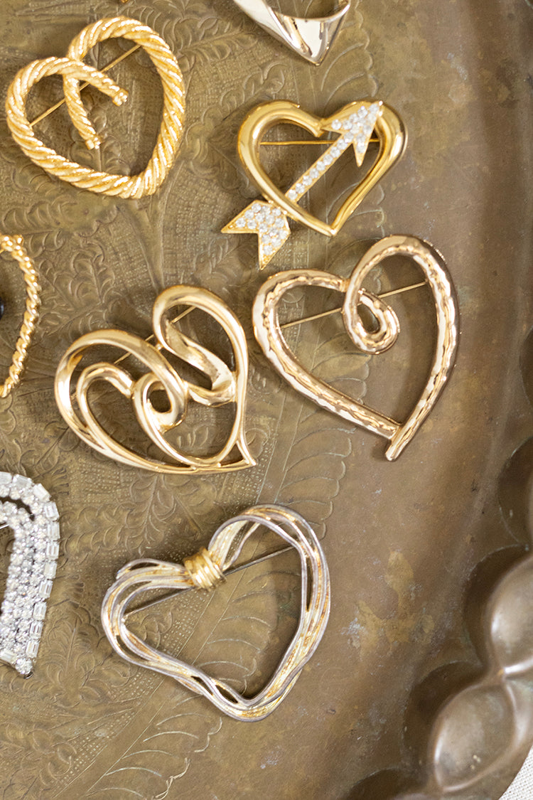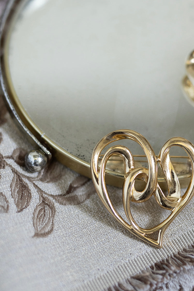 Flowing lines and layered curves define this vintage intertwined heart brooch. Crafted in polished gold-tone metal, the overlapping shapes create a sense of movement and dimension, giving the classic heart motif a more sculptural feel. The balanced design feels expressive without being overly ornate, making it a lovely accent for everyday wear or special occasions.