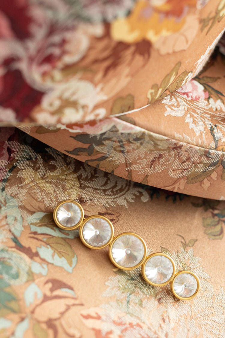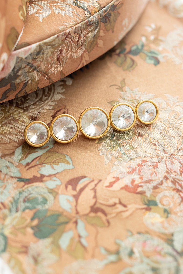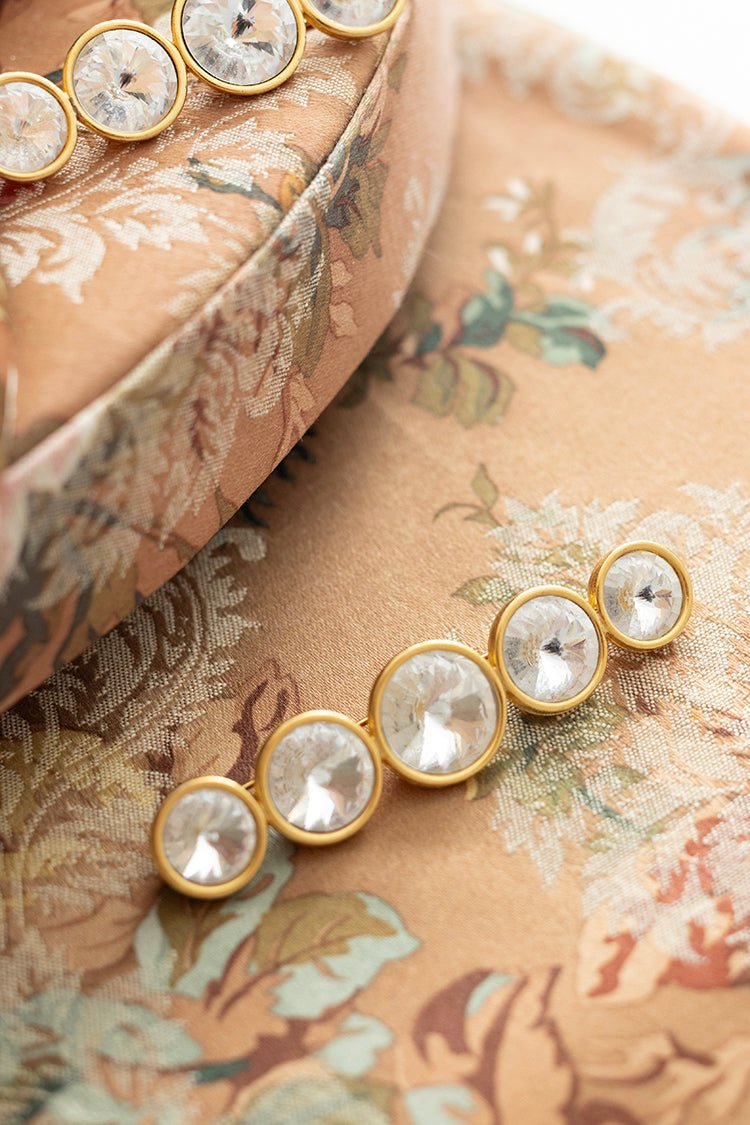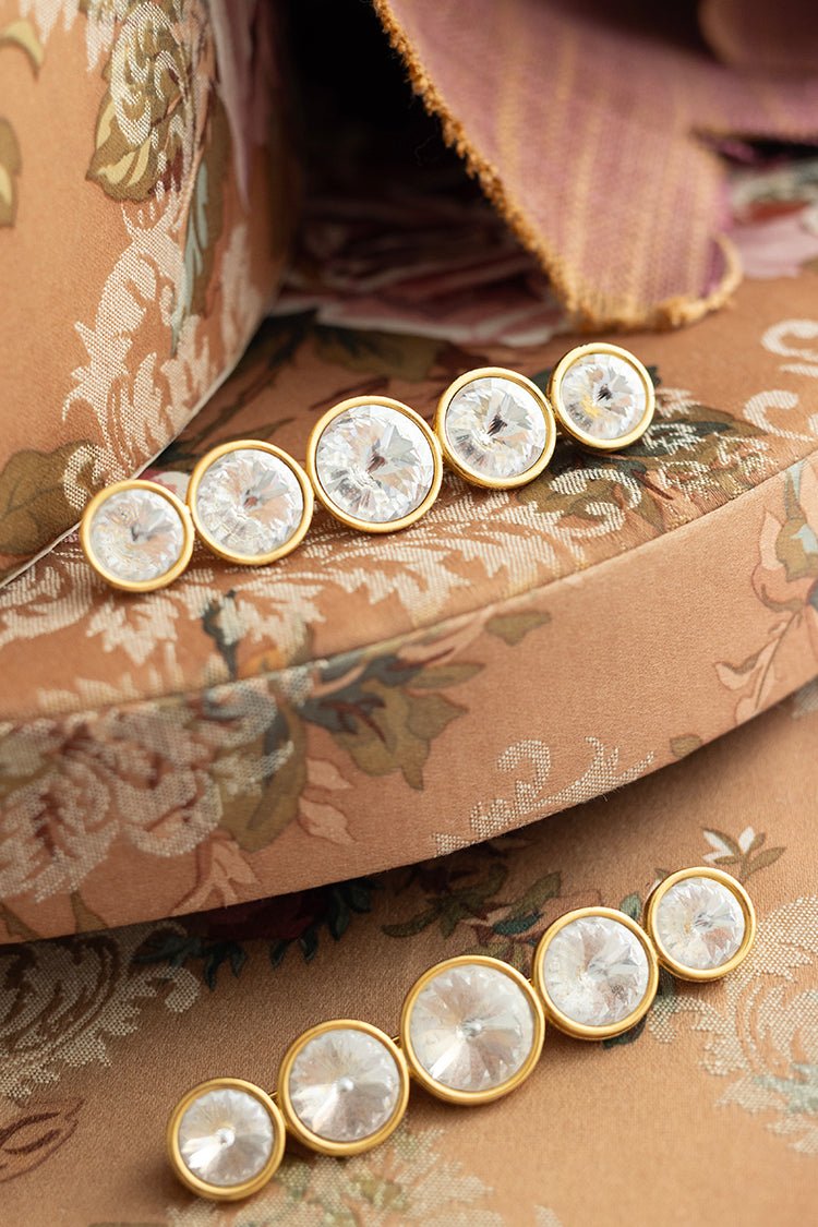 This vintage gold rhinestone bar brooch is a radiant nod to mid-century glamour, featuring a sleek, elongated silhouette adorned with shimmering clear rhinestones that catch the light beautifully. The warm gold-tone finish and classic bar design evoke timeless elegance, making it a versatile accessory for any outfit. Sourced from Long Beach, California, perfect for adding a touch of vintage charm to your wardrobe. Ideal for collectors of vintage costume jewelry and lovers of retro accessories, this brooch is a must-have statement piece that effortlessly blends sophistication with a hint of sparkle.