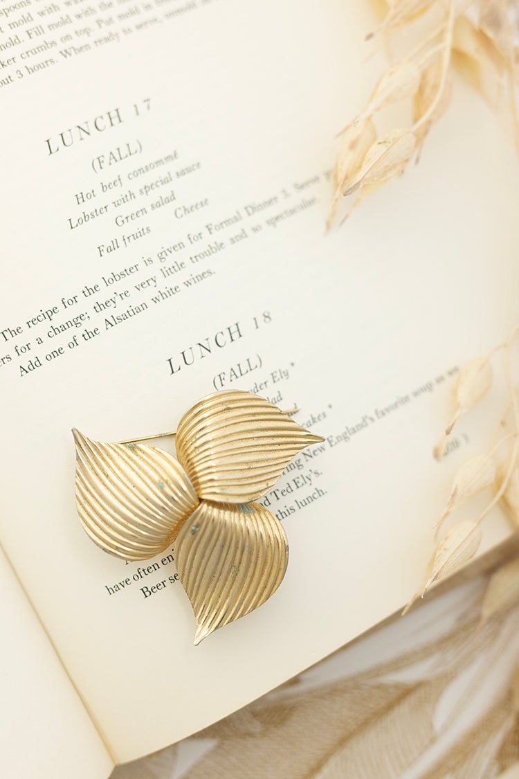 This matte gold brooch features a pretty trio of textured leaves. It's timeless, chic and looks good pinned to anything in your closet.