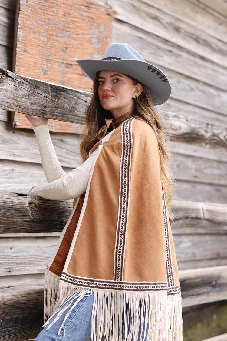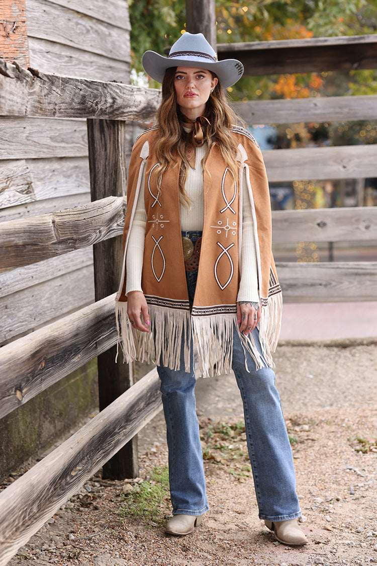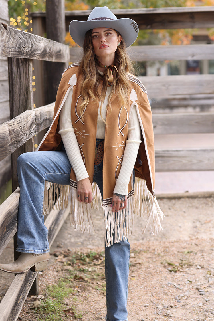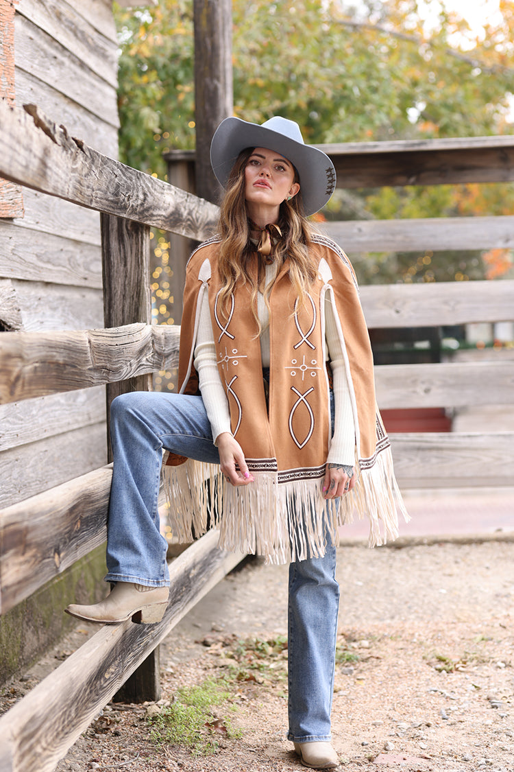 This light brown fringe cape brings statement-making Western-inspired style with beautiful embroidered details and soft mov