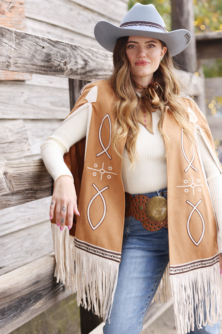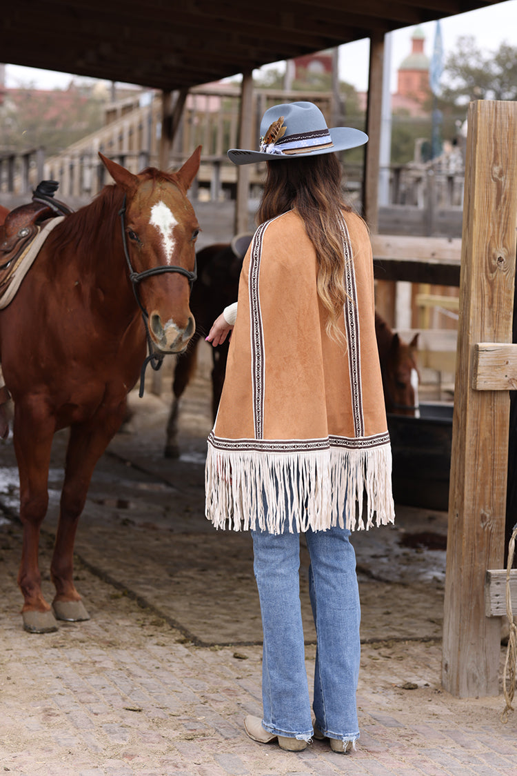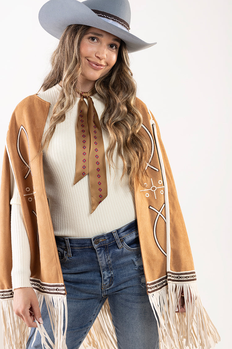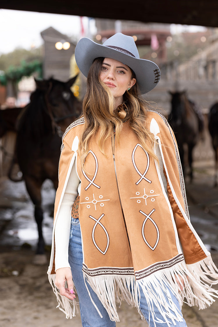 This light brown fringe cape brings statement-making Western-inspired style with beautiful embroidered details and soft mov