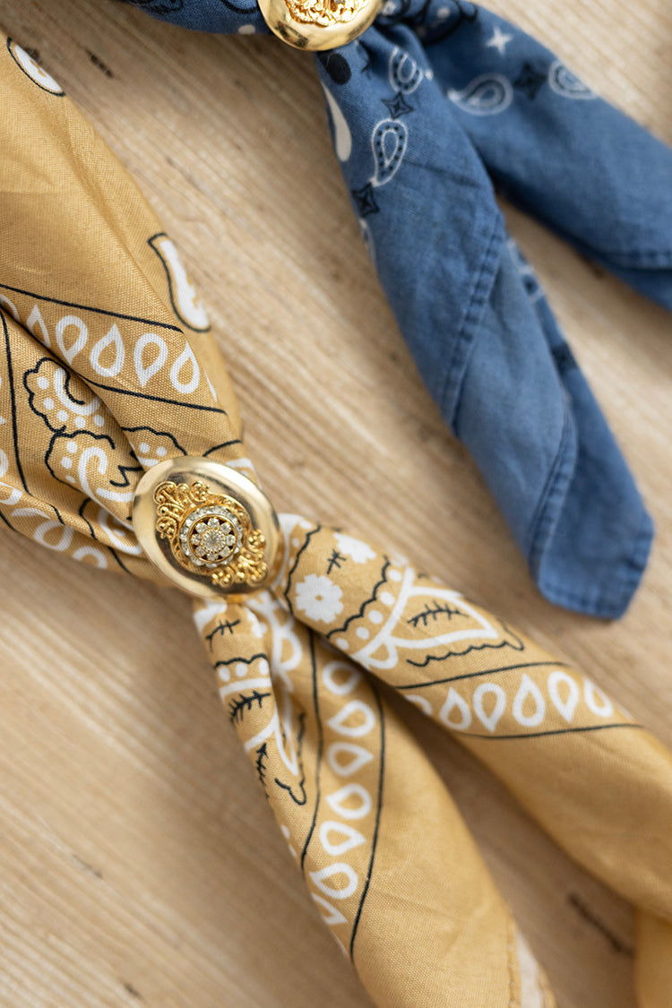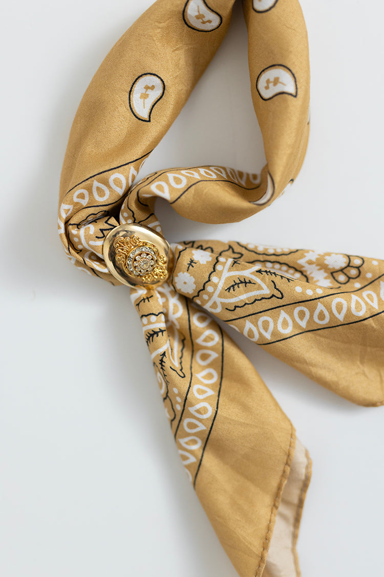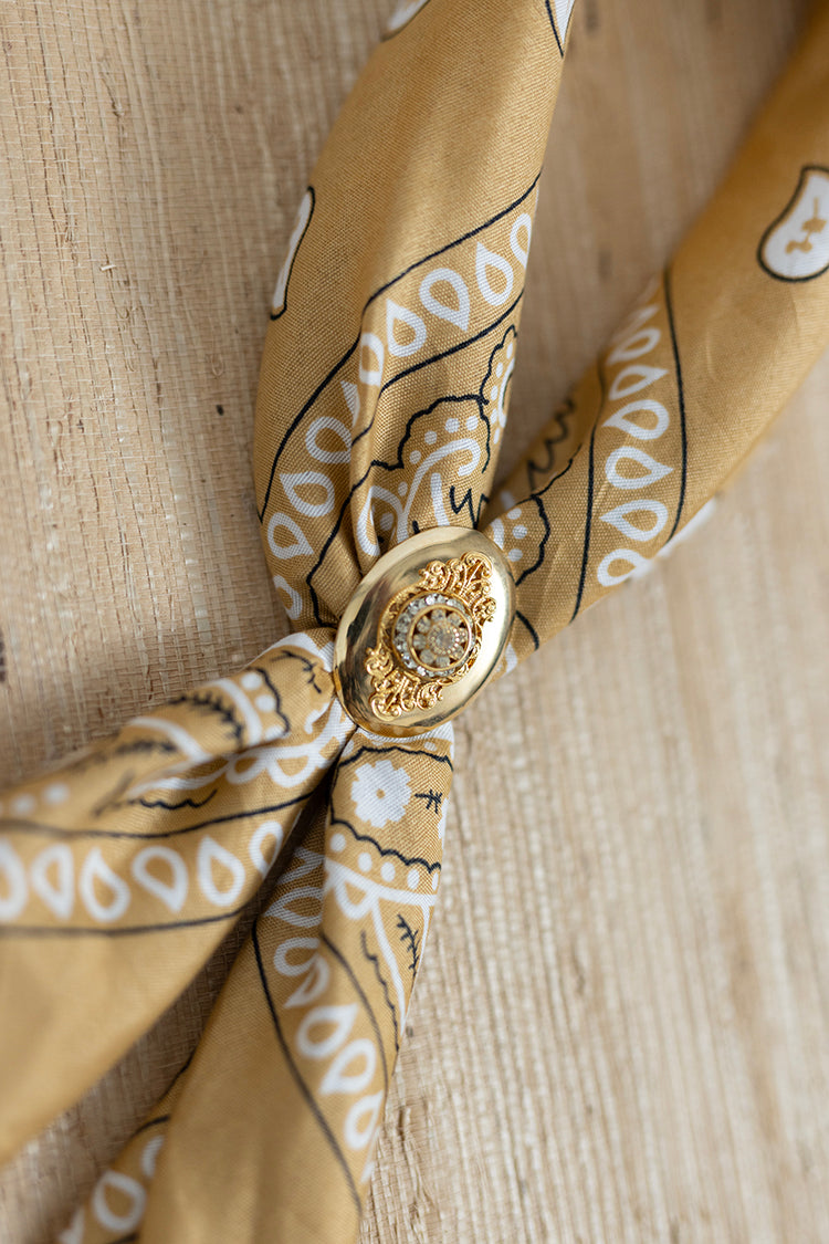 This golden-mustard, classic, paisley bandana gets a chic twist with a gold decorative slide adorned with dainty rhinestones. We hand-selected each bandana and vintage slide in Round Top, Texas during a recent flea market shopping trip. Wear this unique accessory around your neck to give any look cool Western vibes. The slide is removable to also wear the bandana plain or tied around a handbag or belt loop.