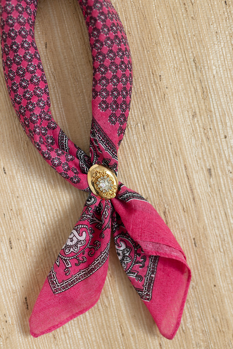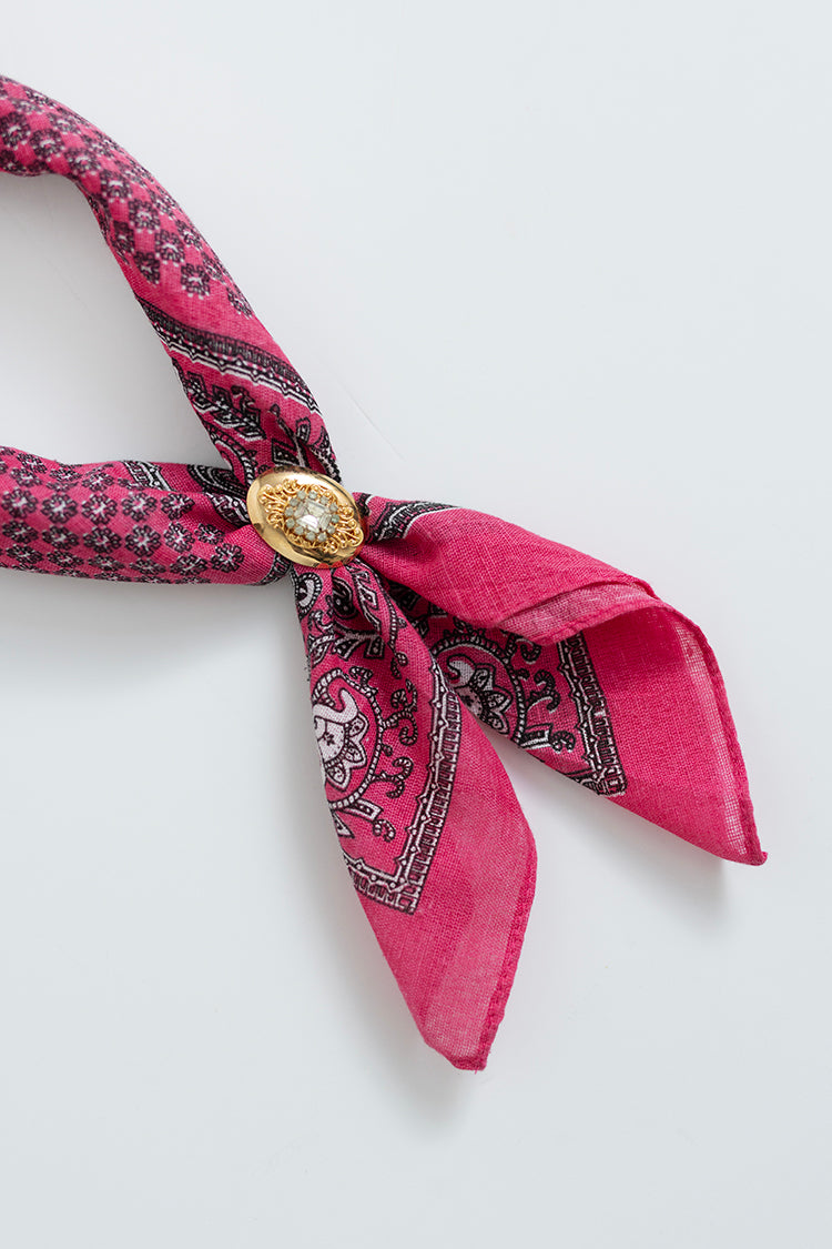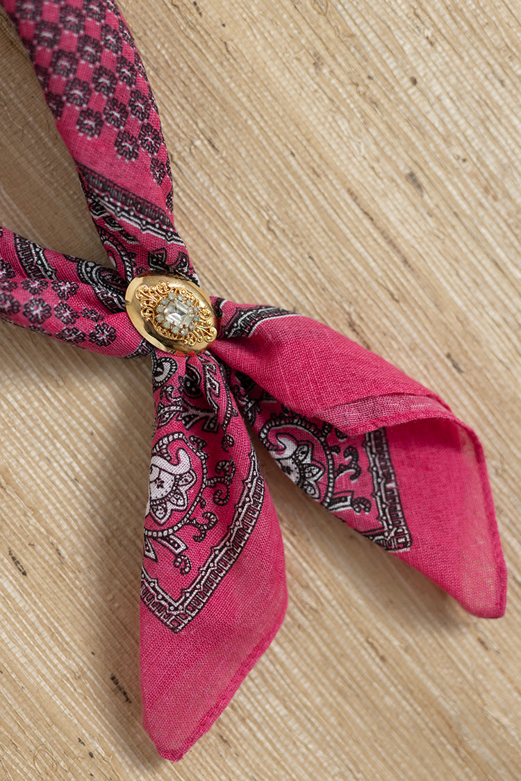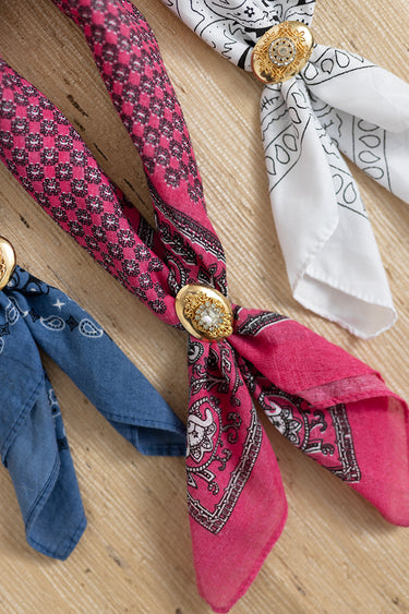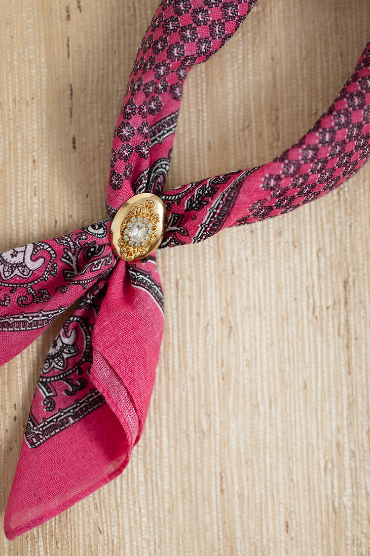 This dark pink paisley print bandana gets a chic twist with a gold decorative slide adorned with dainty rhinestones. We hand-selected each bandana and vintage slide in Round Top, Texas during a recent flea market shopping trip. Wear this unique accessory around your neck to give any look cool Western vibes. The slide is removable to also wear the bandana plain or tied around a handbag or belt loop.