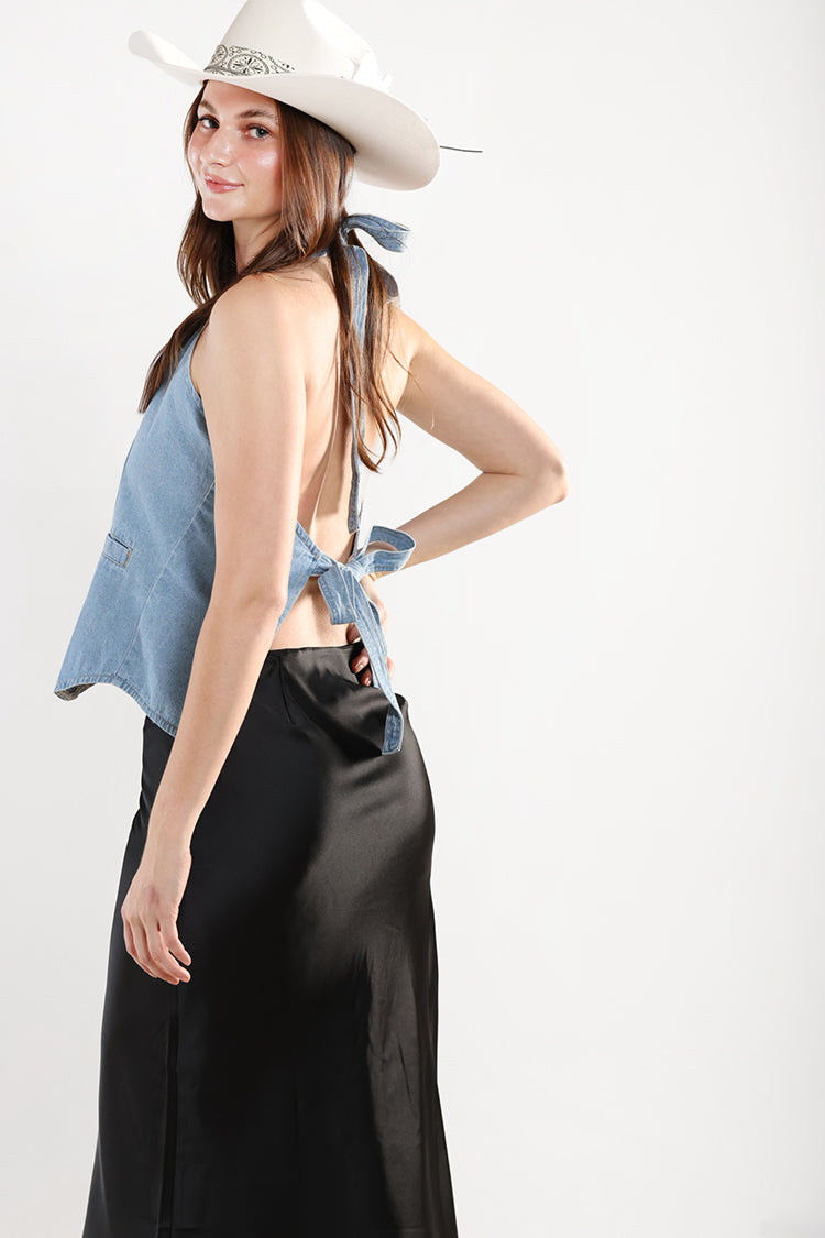 Bias Cut Satin Midi Skirt - Black