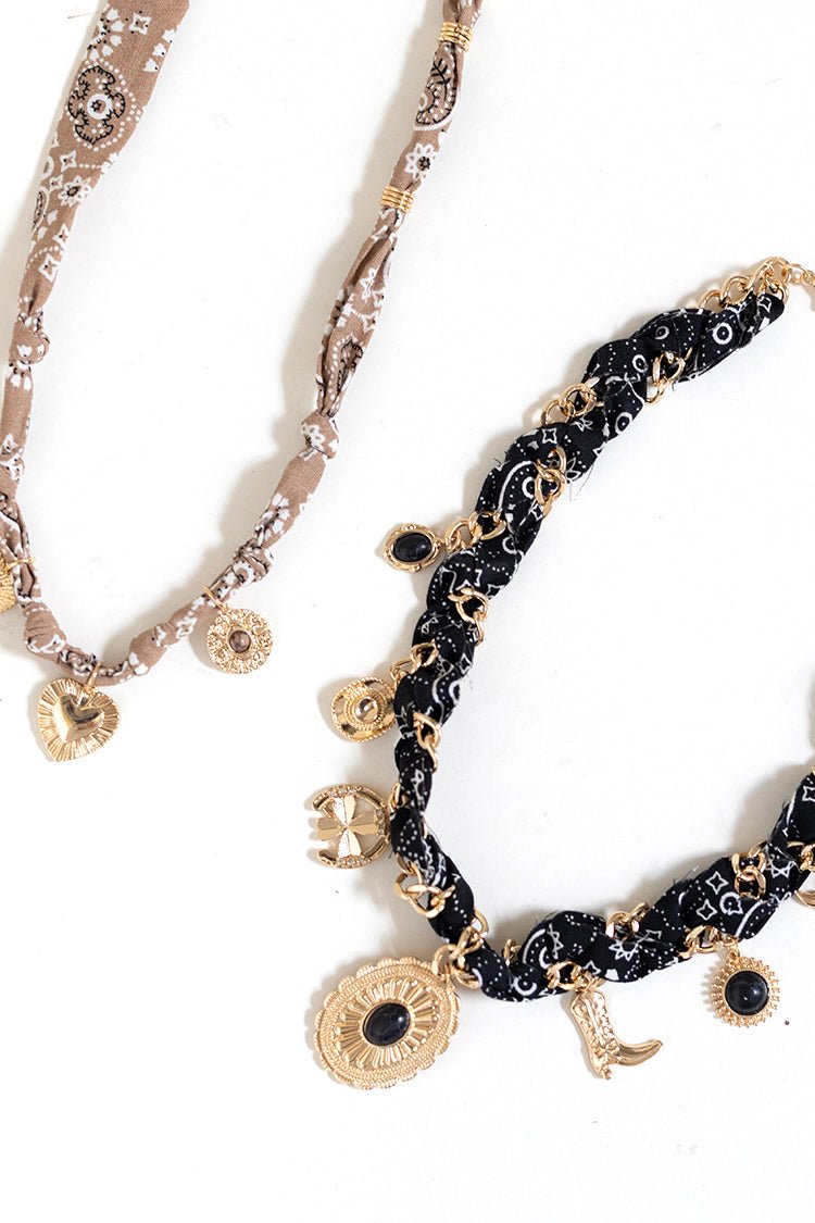 Bring a sweet cowgirl twist to any outfit with this charm necklace featuring a beige bandana-wrapped chain with gold-tone heart charms.