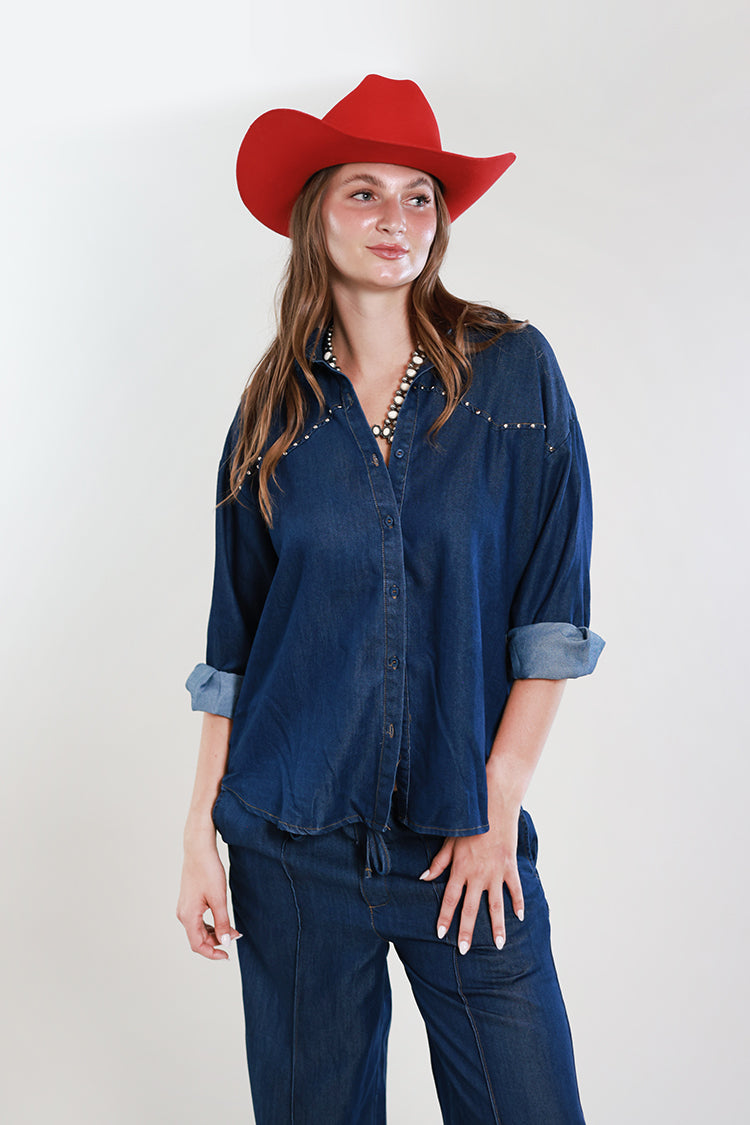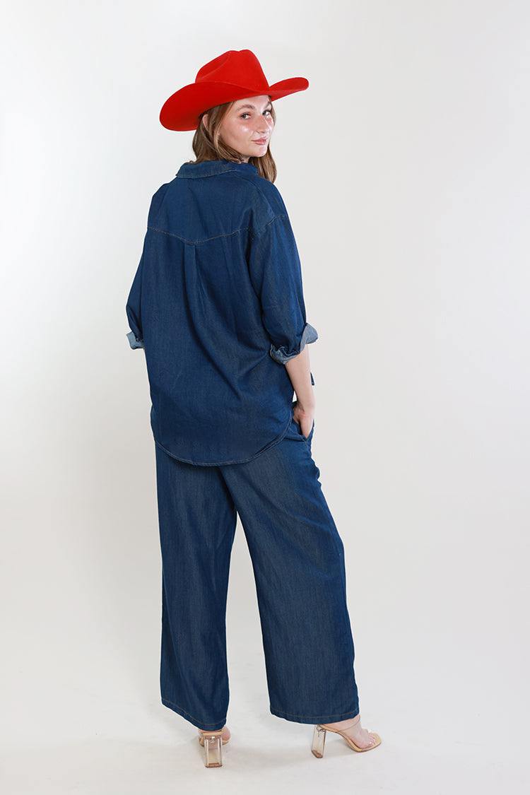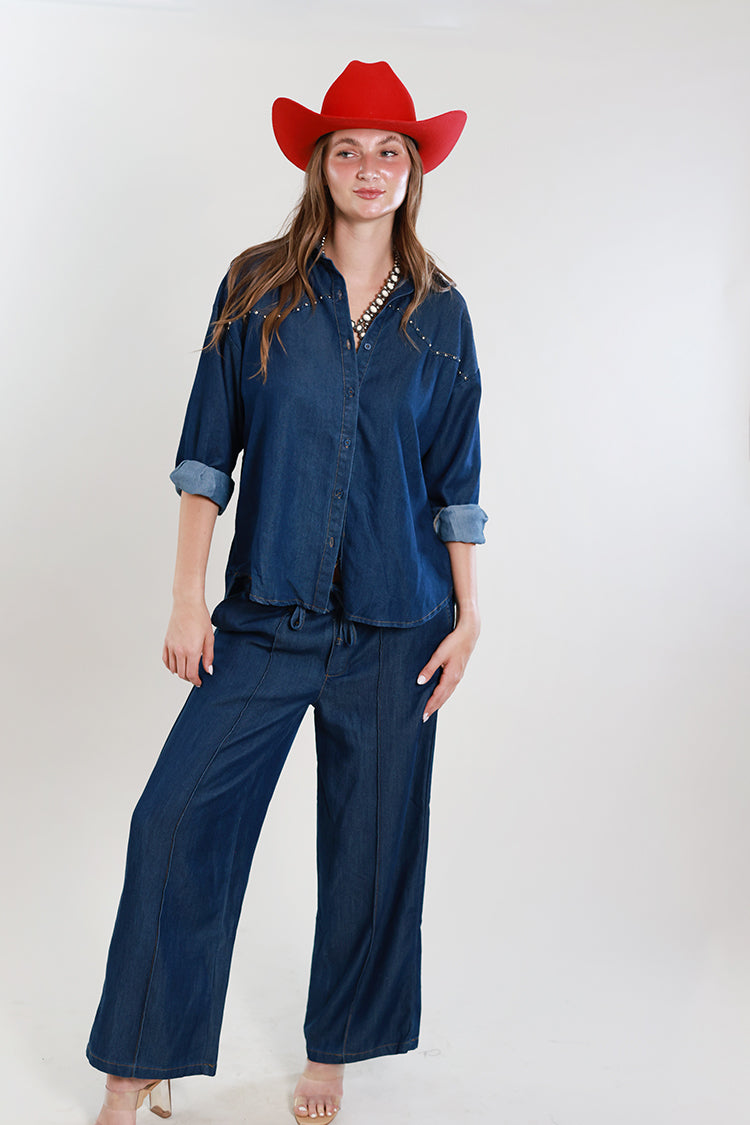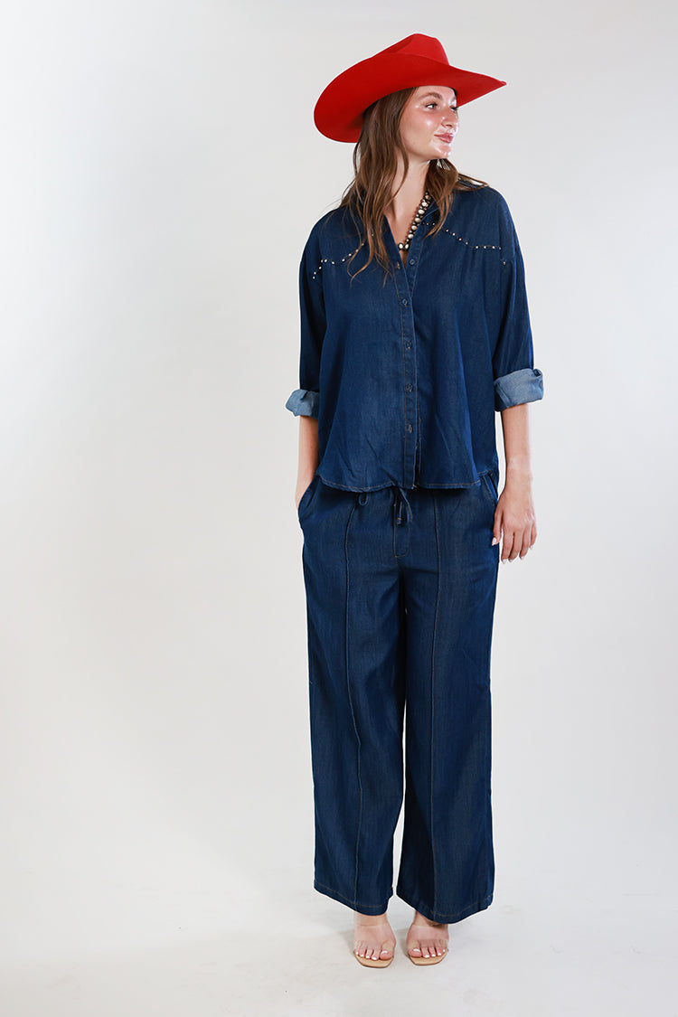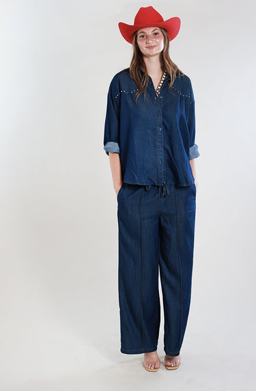 Relaxed and effortlessly cool, these denim chambray pants bring an easy feel to a polished look. Designed with a comfortable elastic waistband, adjustable drawstring and wide leg silhouette, they offer a flattering drape with all-day wearability. The rich denim wash keeps them classic while subtle details tie back to the matching studded button down for a coordinated moment. Wear them together for a statement set or style them on their own with a simple tee or tank.