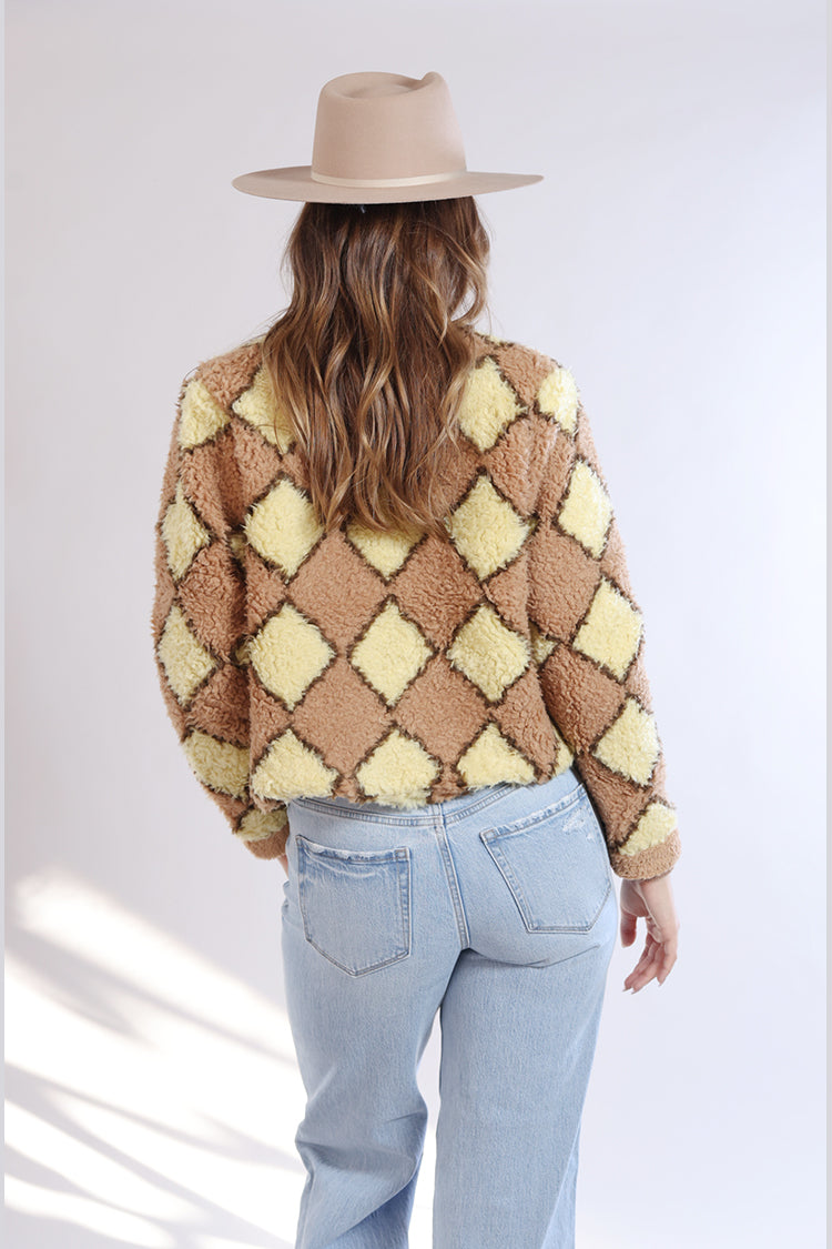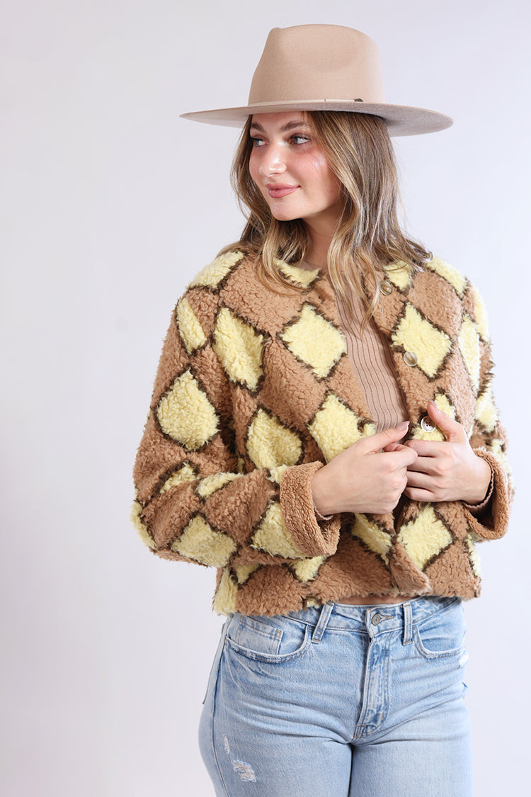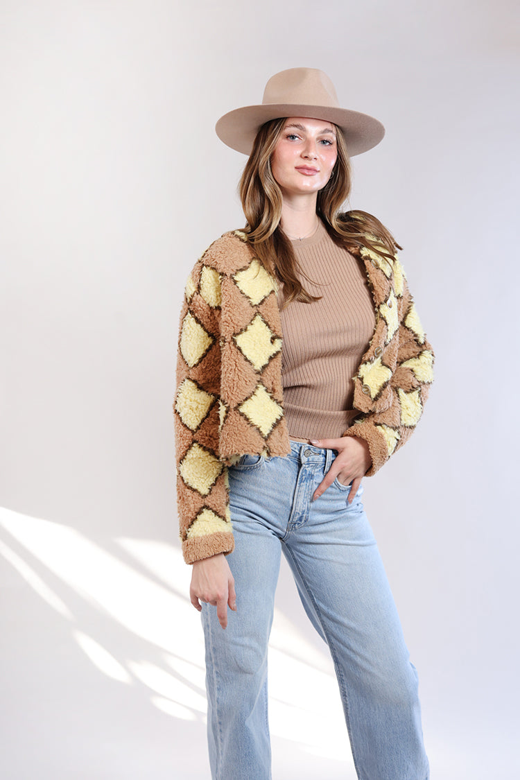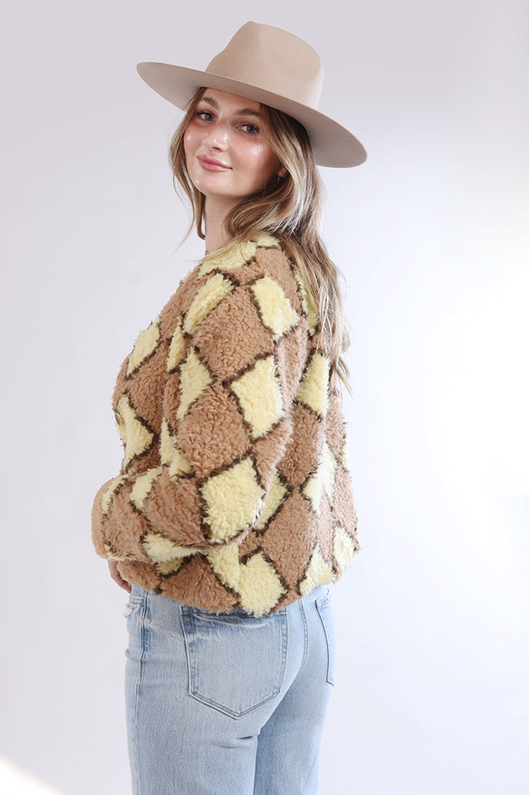 Cozy meets classic in this faux shearling argyle jacket, a modern take on timeless style. Featuring a bold argyle pattern, fun color pairing and plush faux shearling lining , this jacket delivers warmth, texture, and a statement look all in one.