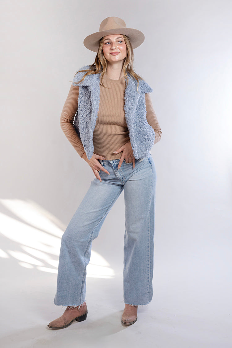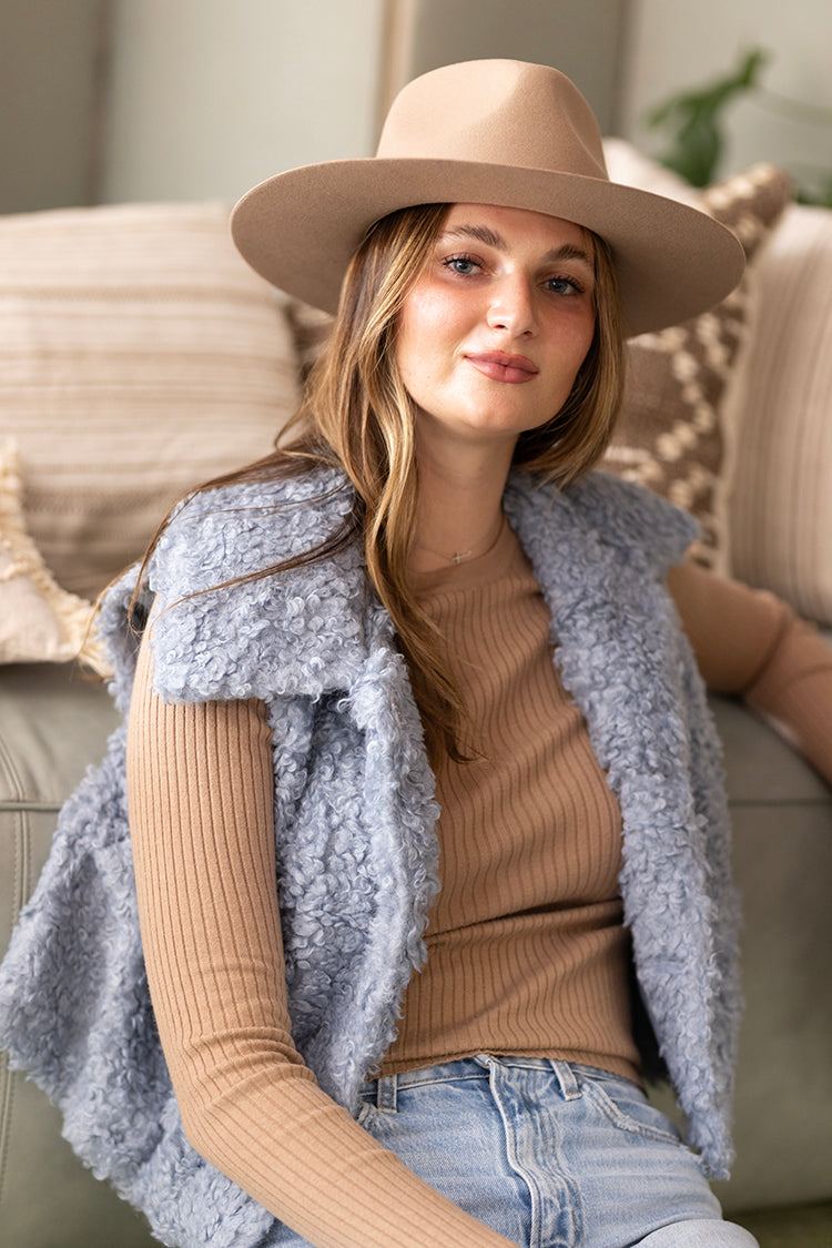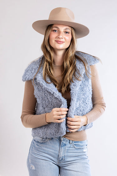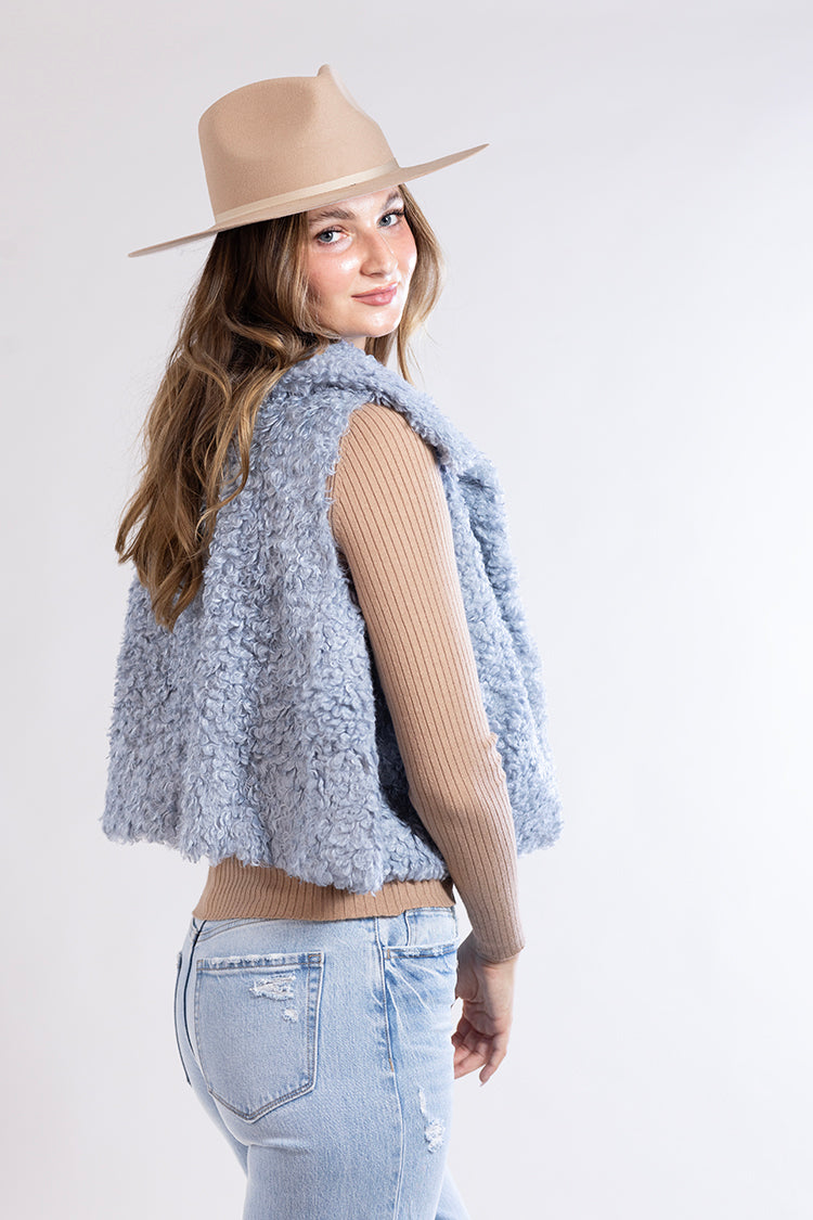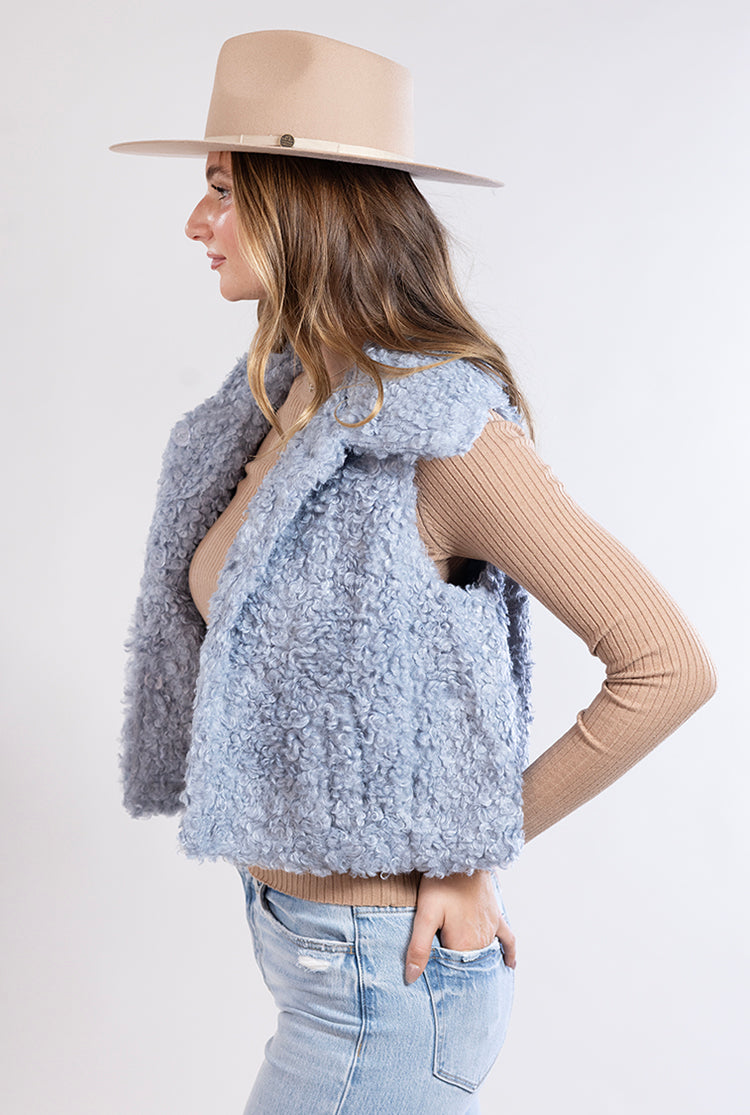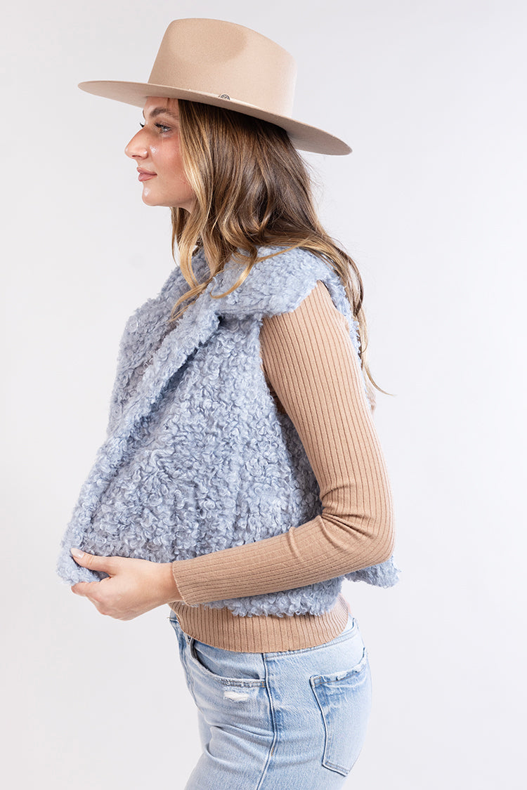 Add cozy texture and effortless polish with this plush layering piece. Designed with a soft boucle finish and relaxed fit, this vest instantly elevates any outfit. The foldover collar and hidden front closure lend a refined touch while keeping things casual-chic.