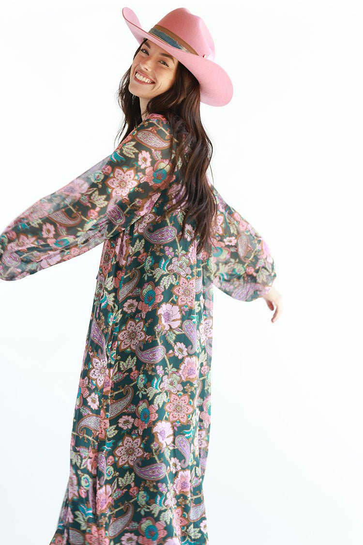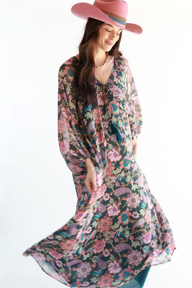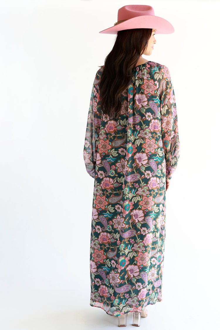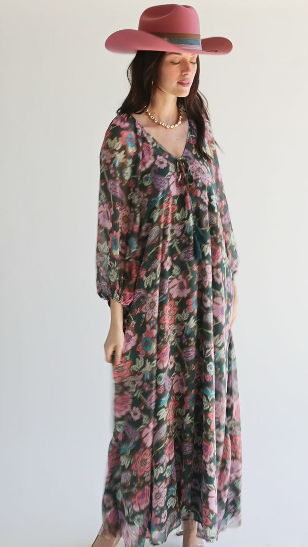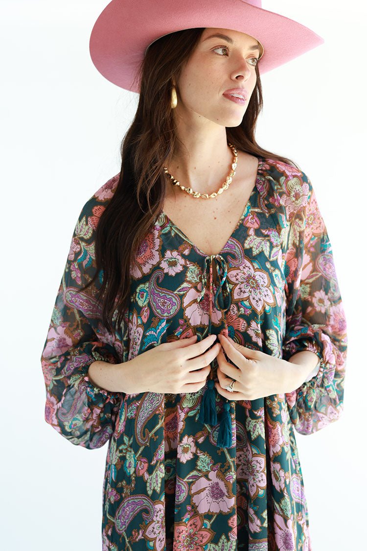 Rich jewel tones make this floral maxi dress shine. The flowy shape and balloon sleeves are classically boho-chic and flattering on a wide range of shapes and sizes. Don't miss the tassel ties detailing the subtle v-neckline.