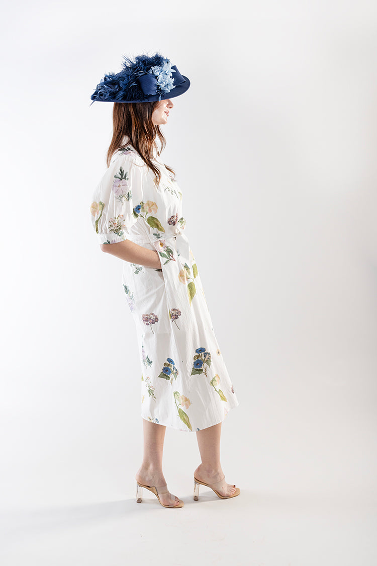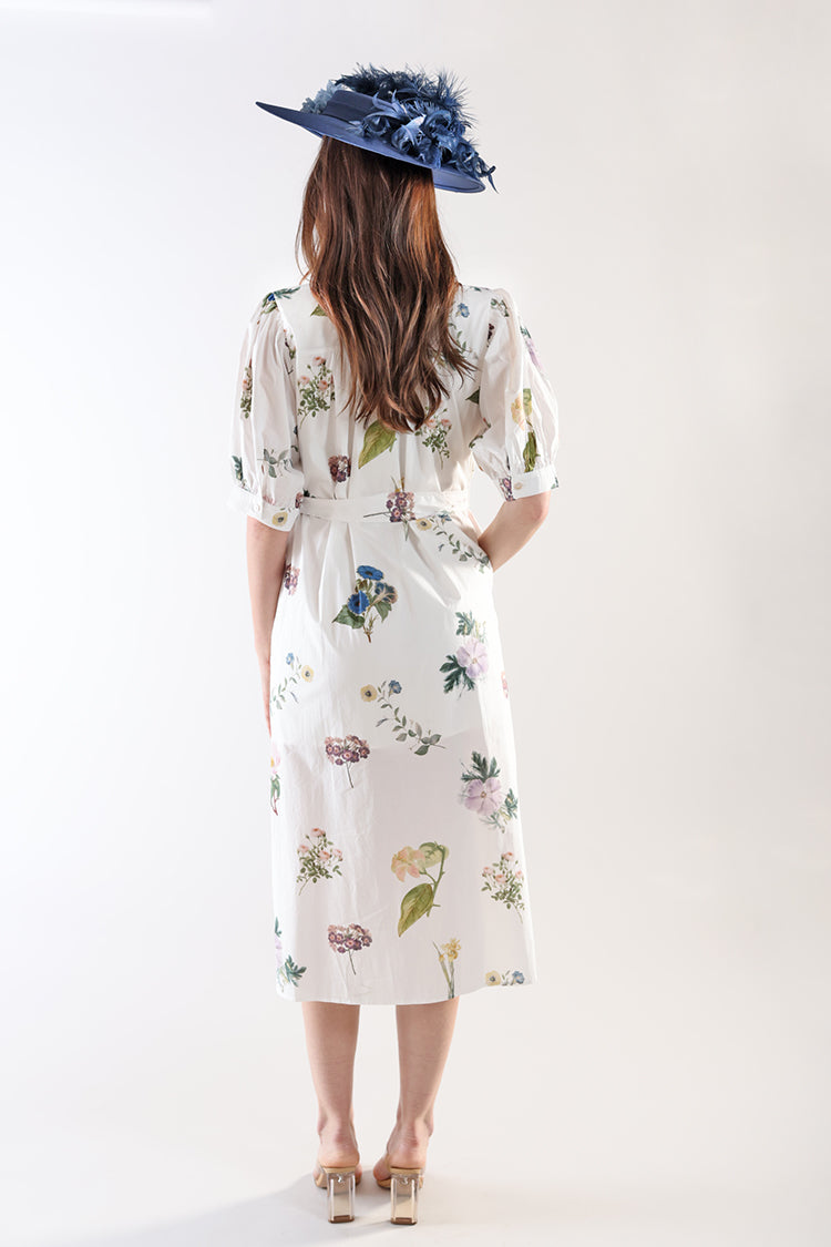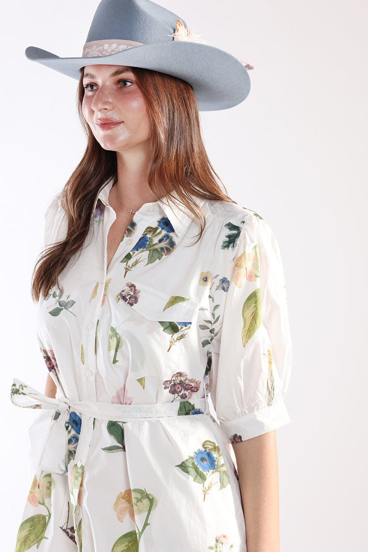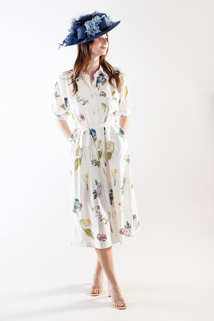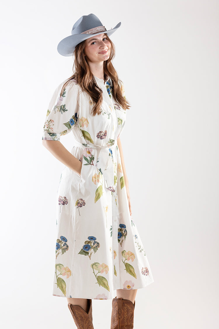 Fresh, feminine, and effortlessly polished, this floral midi dress brings a soft elegance to everyday dressing. Designed with a classic button-front silhouette, puff sleeves, and a flattering tie waist, it creates a beautifully balanced shape that feels both timeless and easy to wear. The delicate botanical print adds a romantic touch while the lightweight fabric keeps it airy and comfortable. It’s the kind of piece that feels just as right for daytime events as it does for relaxed weekend outings.