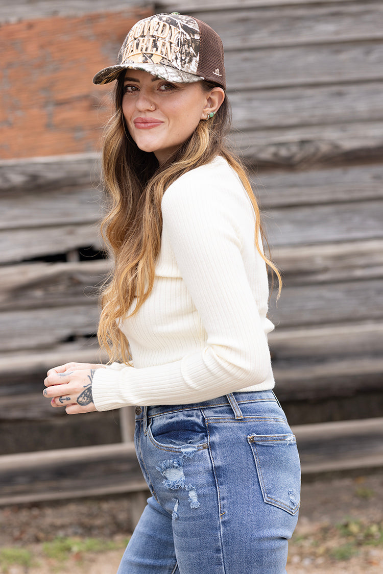 A camo trucker hat with a neutral beige tone, finished with raised embroidered lettering for a playful Western-inspired look. Designed with a breathable mesh back and adjustable snap closure for comfortable, everyday wear. The perfect statement accessory for casual outfits, outdoor days, and laid-back country style.