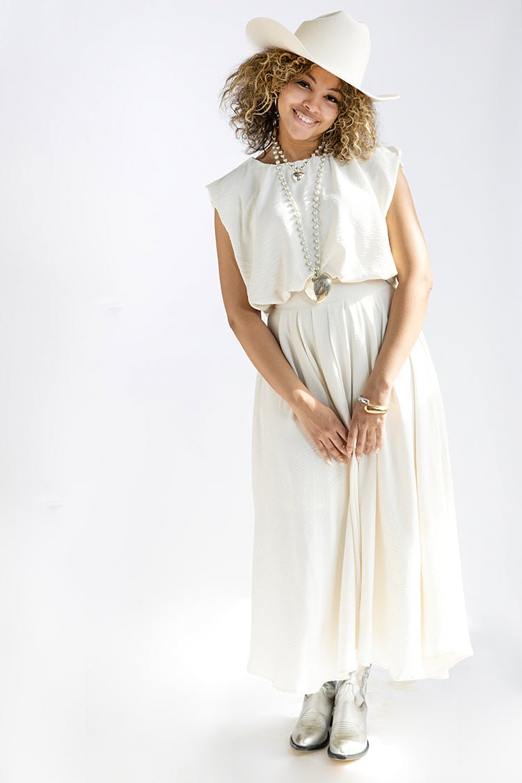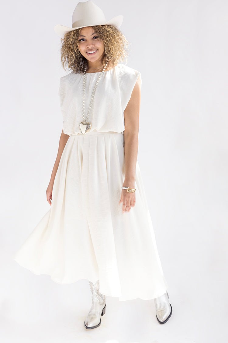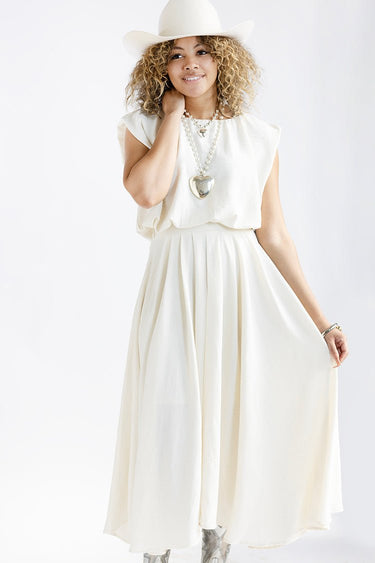 Meet the most perfect skirt! The midi length, comfy elastic waist and flowy silhouette combine to create the perfect staple to wear with a tee, tank or fitted sweater when temps cool.