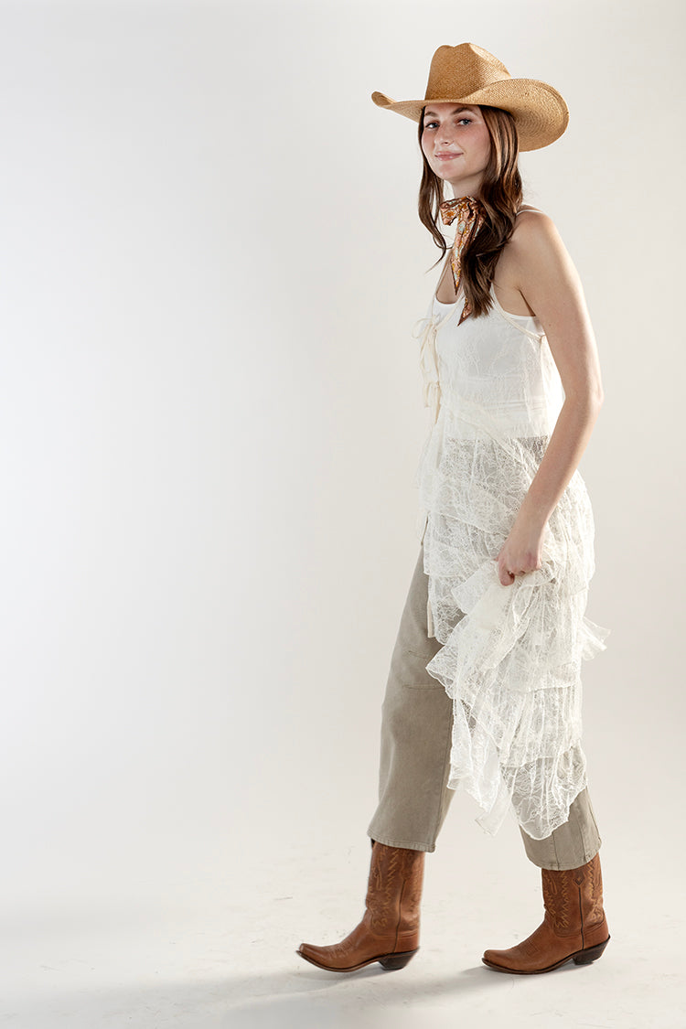 This sheer lace vest duster brings soft movement and vintage-inspired charm to any look. Designed with delicate lace throughout, cascading ruffle tiers, and a flowing open silhouette, this romantic piece layers beautifully for a light, airy feel. The sheer design adds a touch of allure while the long, dramatic length creates an elegant, elongated shape. Perfect for styling over denim or silky dress, this piece adds a dreamy, bohemian vibe to any outfit.