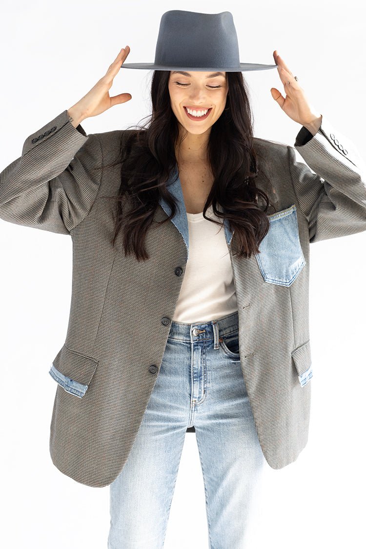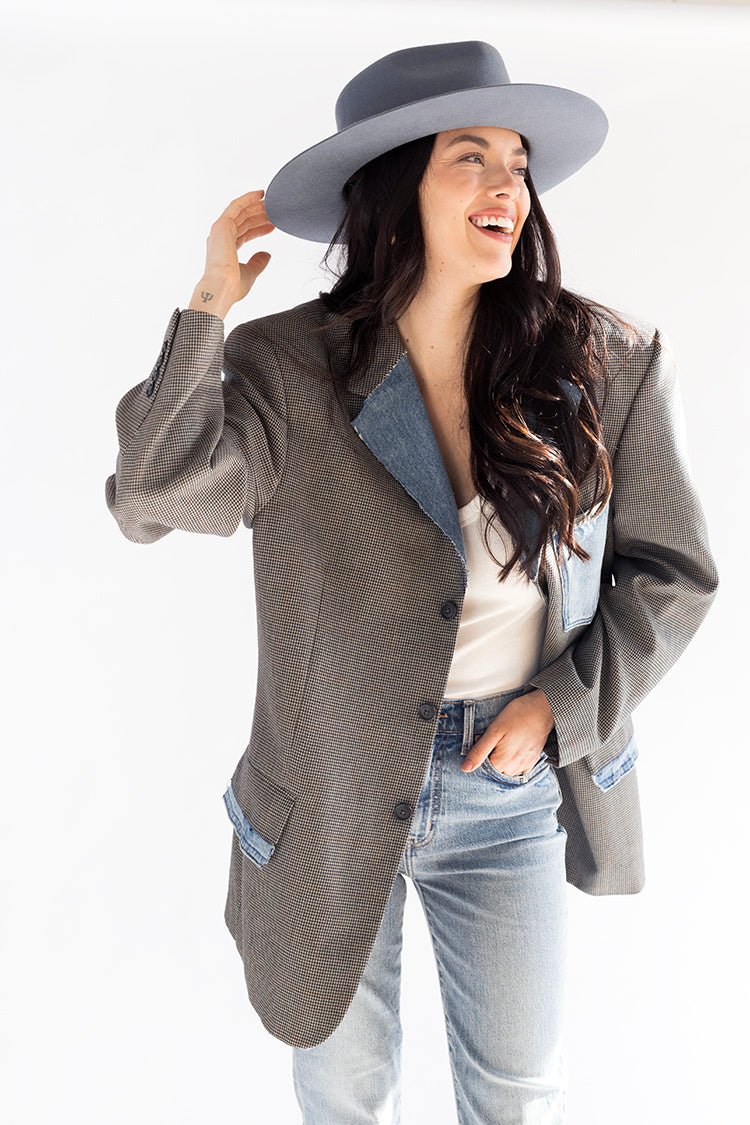 Mix up your flat brim hat assortment with our exclusive Lenny design! The shorter brim brings all the style while not being too overwhelming in size. This dusty blue color works for all four seasons. Add a hat band and accessories to personalize.