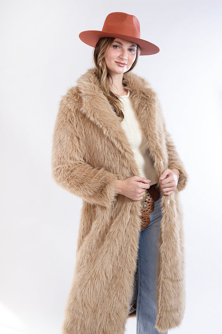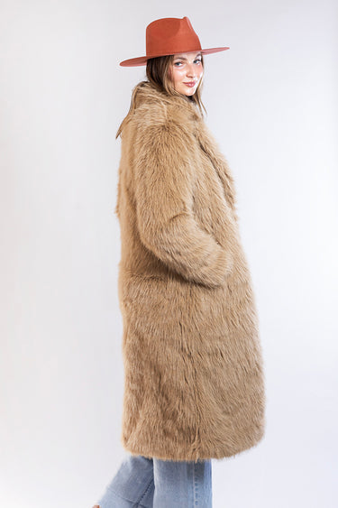Add luxe warmth and vintage-inspired flair with our faux fur camel jacket. The cozy notch collar, longline cut and convenient pockets make it perfect for layering over denim or dresses all season long. The jacket’s western-inspired horse lining adds a playful surprise that feels uniquely Flea Style.