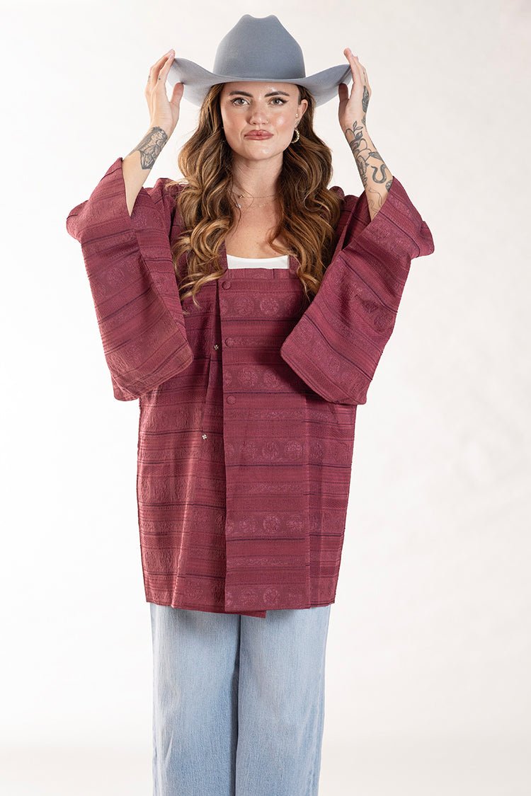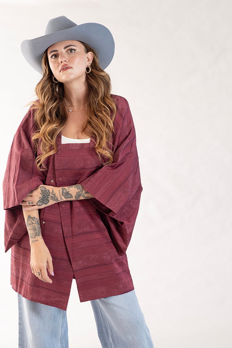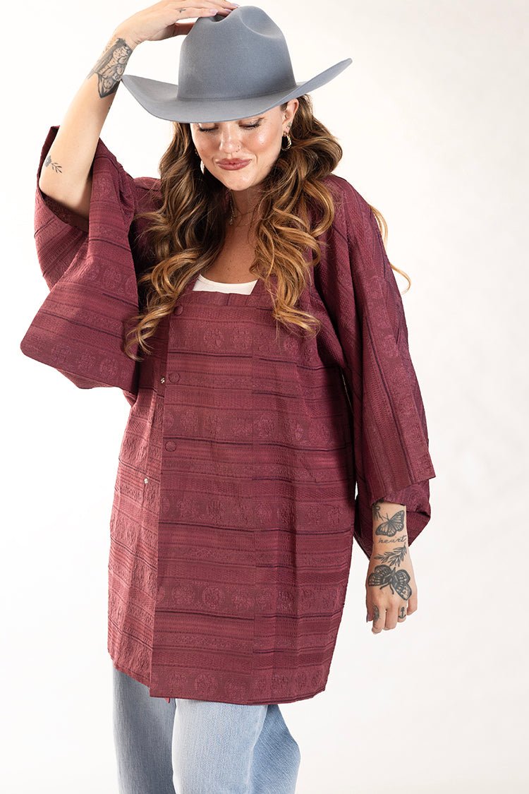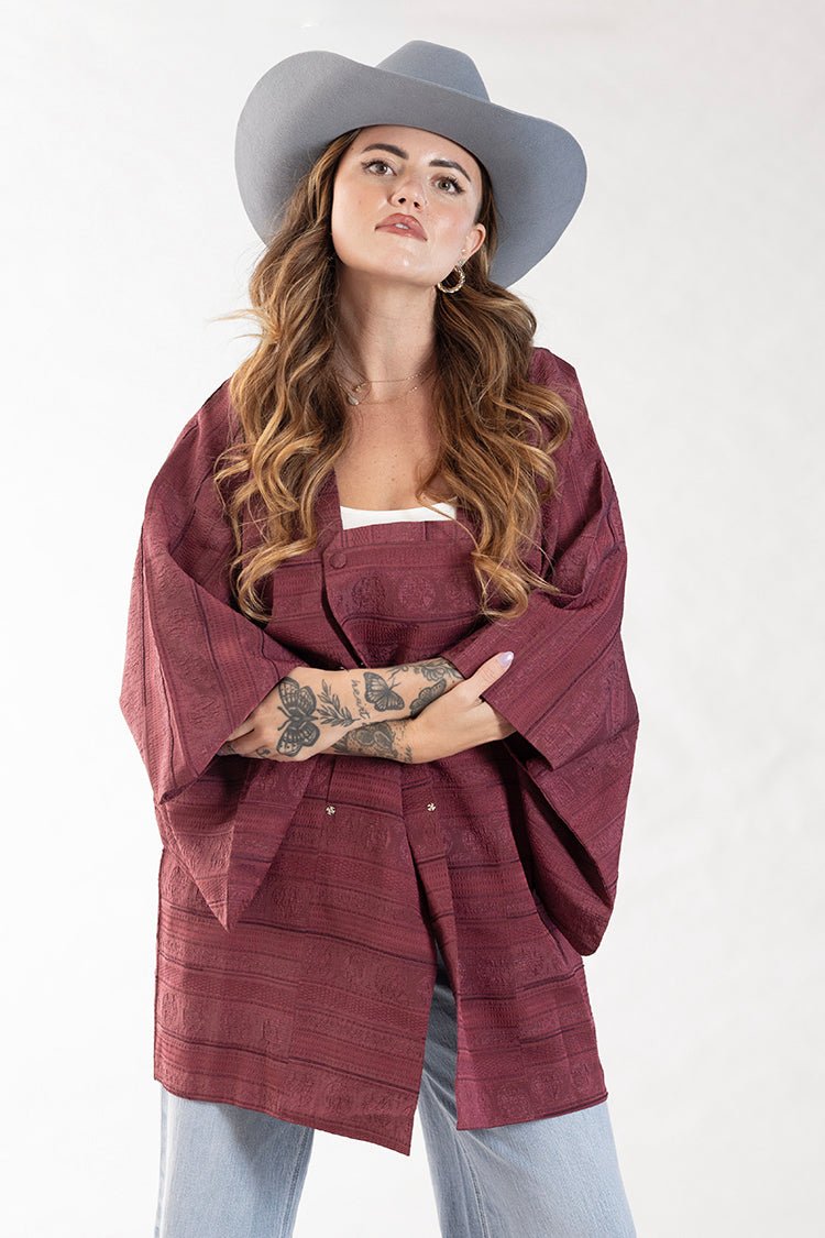 We hand-curate our vintage kimonos from California flea markets with love and care. We added a denim butterfly to this maroon textured print style for extra flair. Exclusive to Flea Style and available online-only, this breezy layering piece is a unique treasure that adds artistry and personality to your wardrobe.