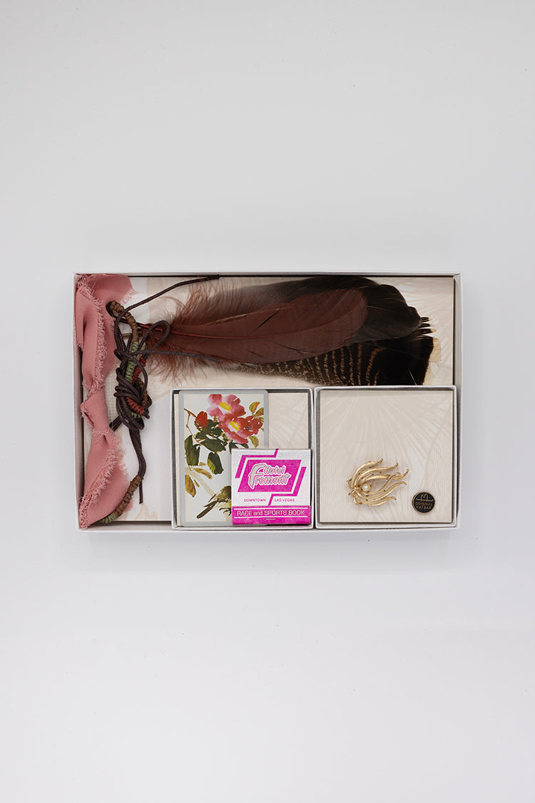 - Includes feathers, hatbands, a playing card, matchbook, vintage brooch and Original Hat Bar bronze pin