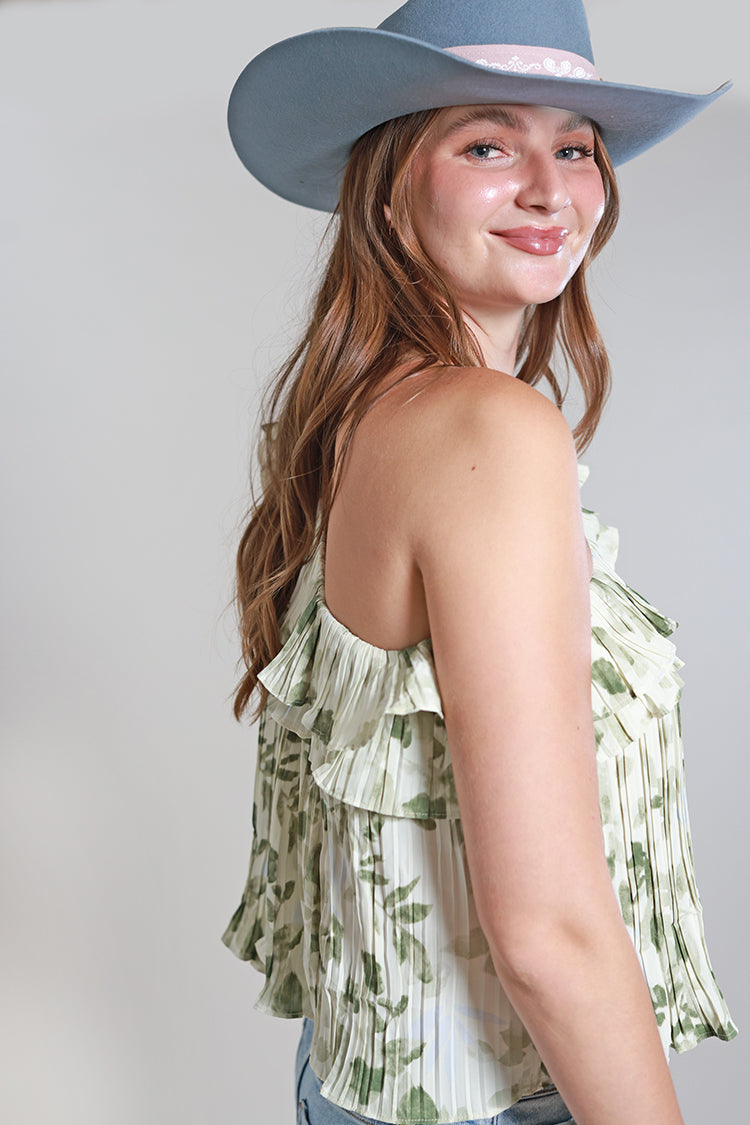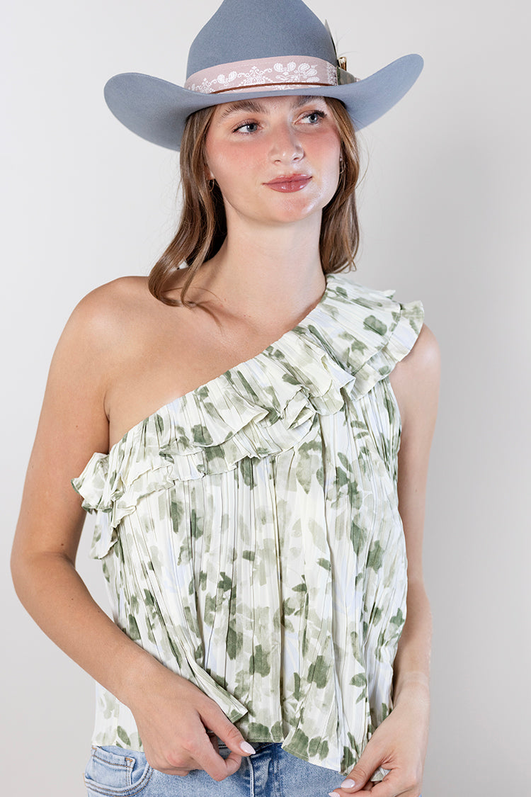 Fresh, feminine and full of charm, this one-shoulder top brings a playful twist to warm-weather styling. Designed in a soft green floral print with delicate pleating and a flowy silhouette, it feels light and effortless while still making a statement. The ruffle detail along the neckline adds a flirty touch that enhances the asymmetrical shape. Easy to pair with denim, skirts or tailored shorts, it’s a standout piece that feels just as fun as it looks.