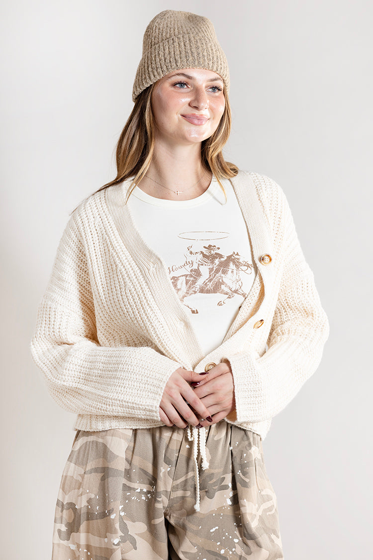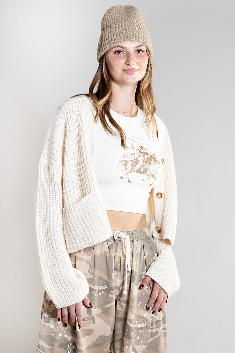 This chunky knit cardigan brings easy warmth and everyday comfort with its soft texture and timeless, relaxed design. Front pockets and a lived-in feel make it an instant favorite for layering, whether you're keeping it casual or getting cozy. This versatile staple pairs effortlessly with everything in your closet.