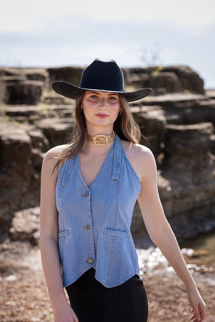 Add a touch of cowgirl to any look with our curled brim wool Rider hat in a versatile, black color. Book a virtual session with one of our stylists to customize your hat band and make it uniquely you.