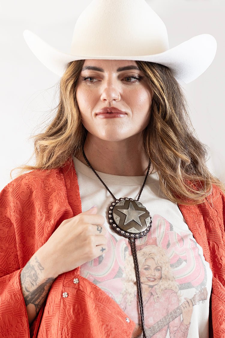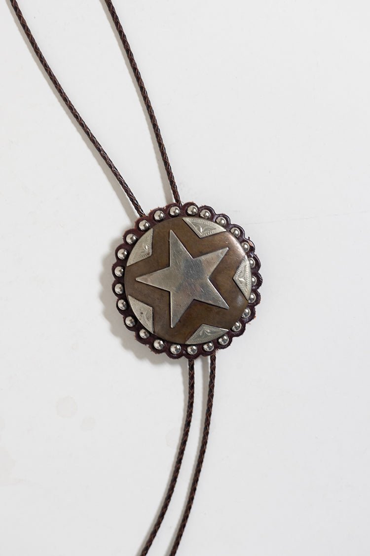 Add instant western charm with this scalloped, mixed metal, star, medallion bolo tie. Handmade in our Dallas design studio and exclusive to Flea Style, this online-only piece features a vintage medallion with a bold raised star at the center and detailed scalloped edges. Finished with a braided cord, it’s a versatile accessory that brings standout cowgirl style.