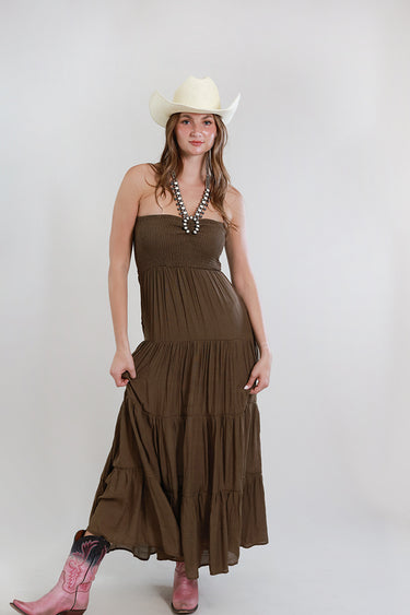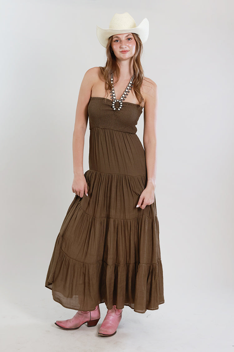 This brown smocked maxi dress is an easy, versatile piece made for warm weather days. Designed with a stretchy smocked bodice and flowing tiered skirt, it creates a flattering silhouette that feels as comfortable as it looks. The strapless neckline keeps it clean and effortless while the soft movement adds a relaxed feel with every step. Dress it up with a bold necklace or throw on sneakers or flat sandals for a casual day look.