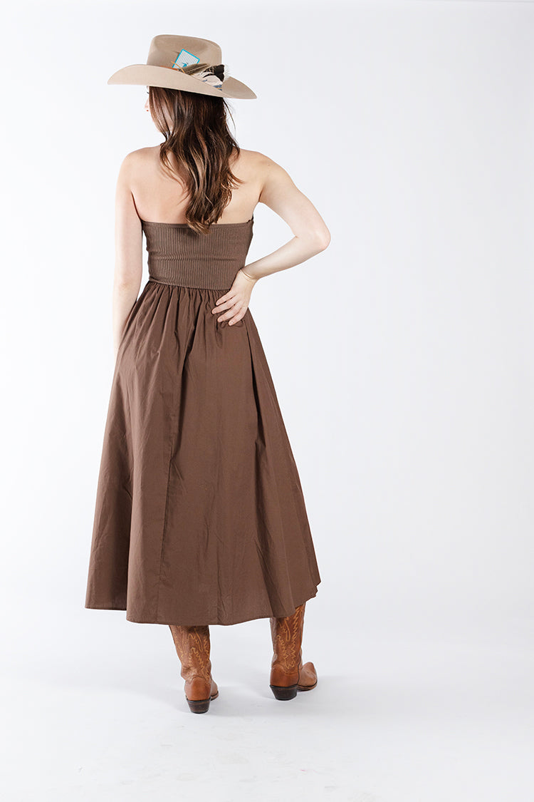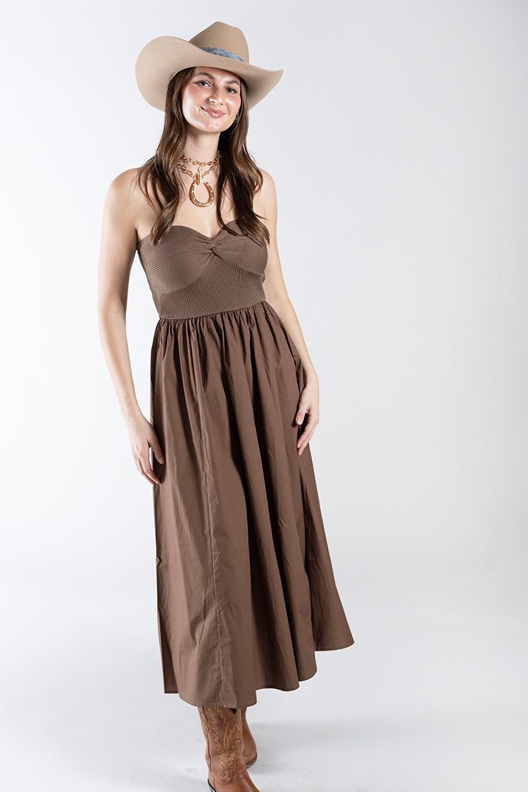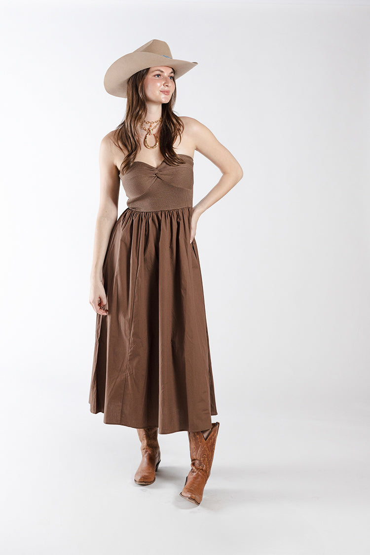 This striking dress blends modern texture with a softly feminine silhouette. Featuring a strapless neckline with a twisted ribbed knit bodice and a flowing woven skirt, this dress creates a beautiful contrast of structure and movement. The fitted but stretchy bodice offers a flattering shape while the full skirt adds effortless volume and elegance that's easy to wear anywhere.