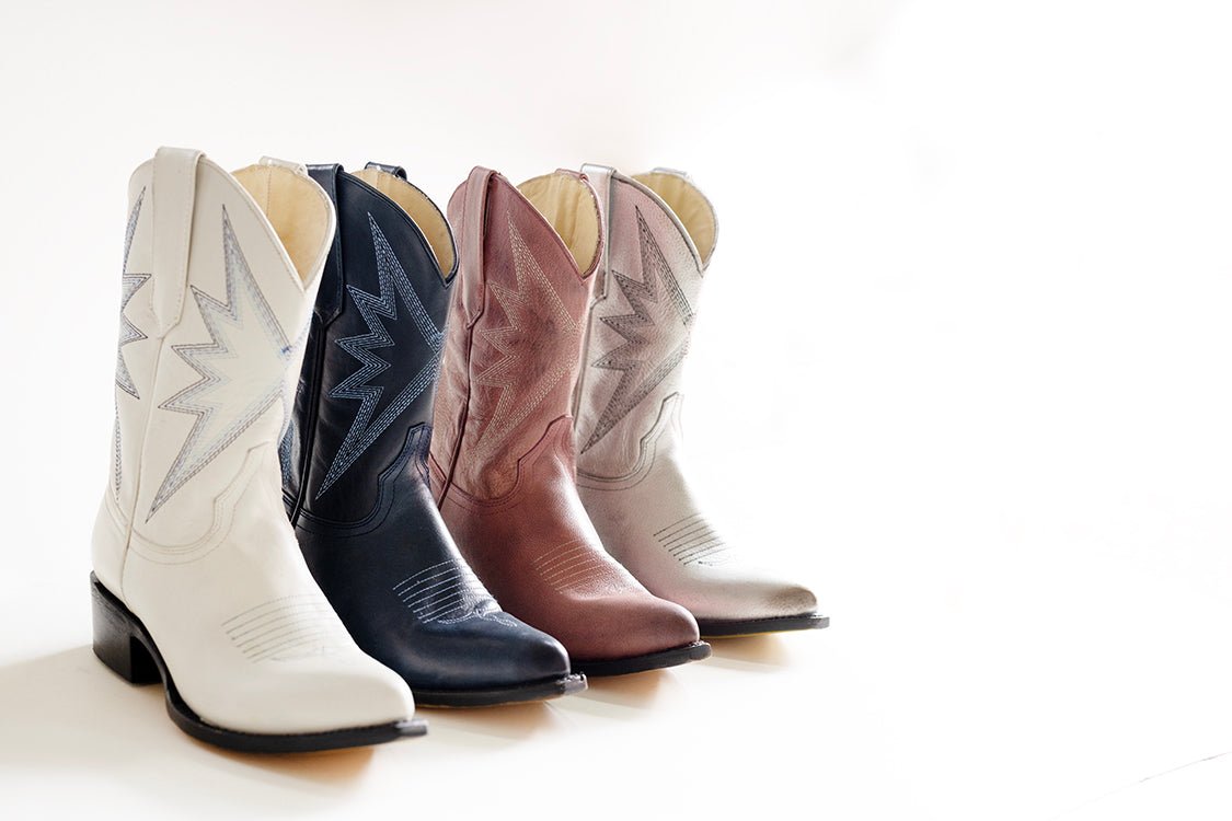 These deep blue cowgirl boots are classic, but oh so cool. A fun sunburst design in contrasting blue stitching adds extra flair to these transitional 11" tall, supple leather beauties.