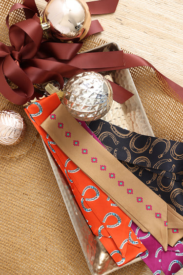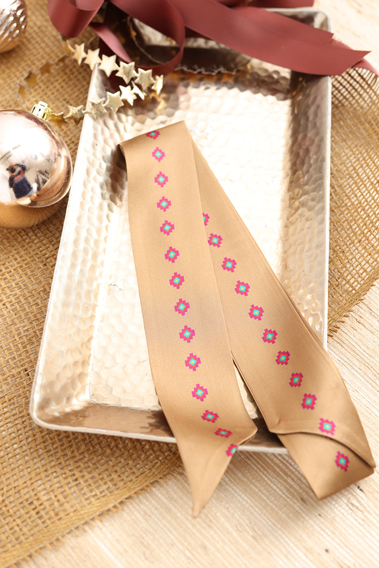 Add a touch of Southwestern charm to your look with this beautifully patterned twilly scarf. Its warm tan base is accented with vibrant geometric motifs, creating a stylish accessory that stands out without overpowering your outfit. Designed for versatility, it can be worn as a neck scarf, wrapped around a hat, tied onto a bag or styled as a chic hair accessory.