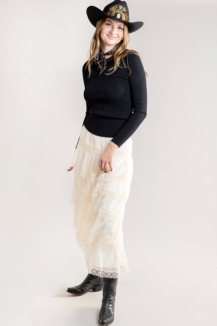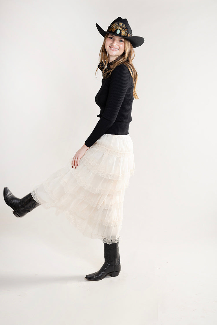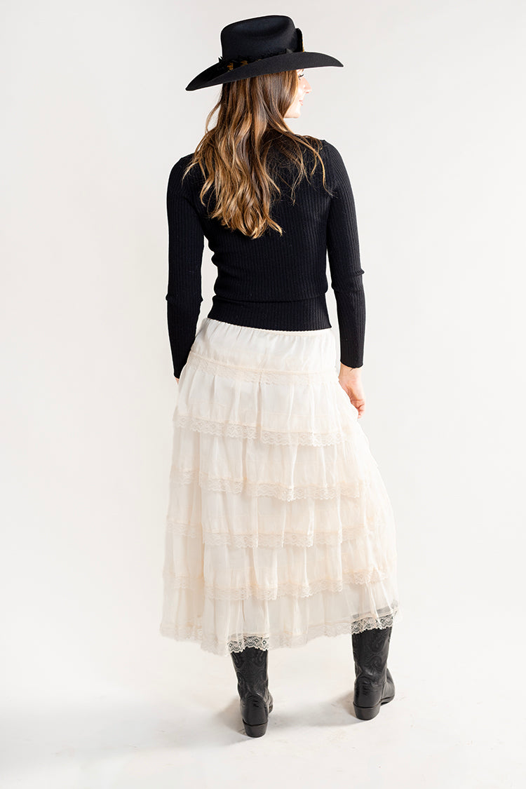 Tiered Chiffon Lace Midi Skirt - Ivory
