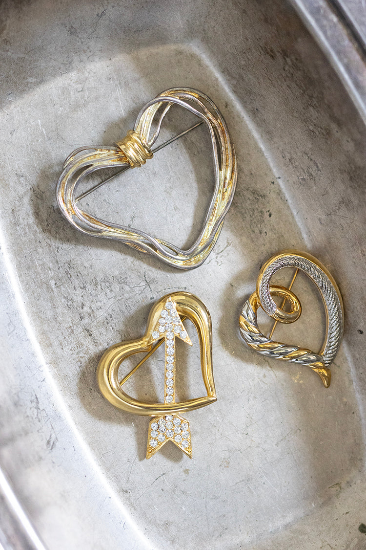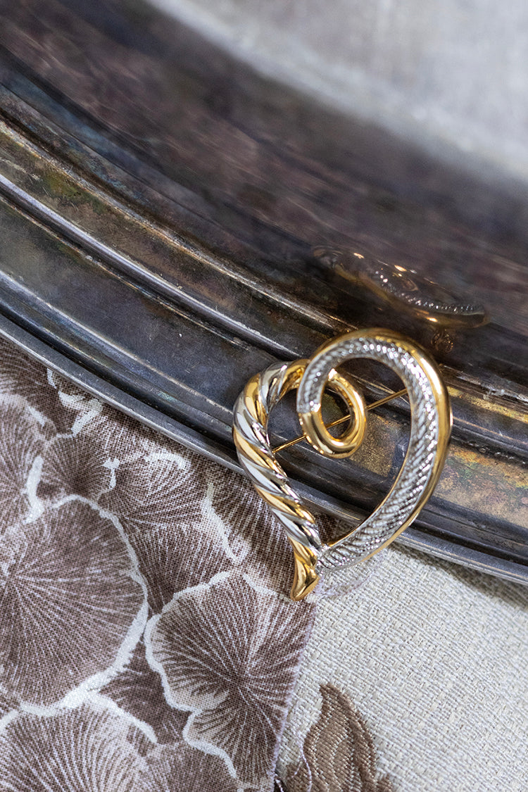 Sculptural curves and contrasting textures give this vintage heart brooch a distinctive presence. Crafted in mixed metals, the asymmetrical design blends twisted detailing with softly textured surfaces. Its open form keeps the look light while still making a statement. A beautiful accent for a jacket or scarf, perfect for anyone who enjoys romantic shapes with a modern edge.
