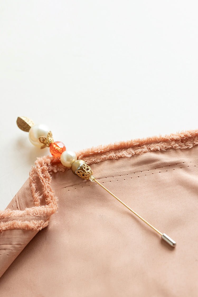 This vintage gold stick pin is pure drama in the dreamiest way. Featuring creamy faux pearls, a fiery amber crystal bead, and ornate gold filigree accents, it’s a little slice of heirloom glam. The elongated silhouette makes it the perfect statement piece for scarves, blazers, a beret or a Flea Style hat. Sourced from Long Beach, California, this one-of-a-kind treasure brings timeless sophistication and just a hint of Old Hollywood.