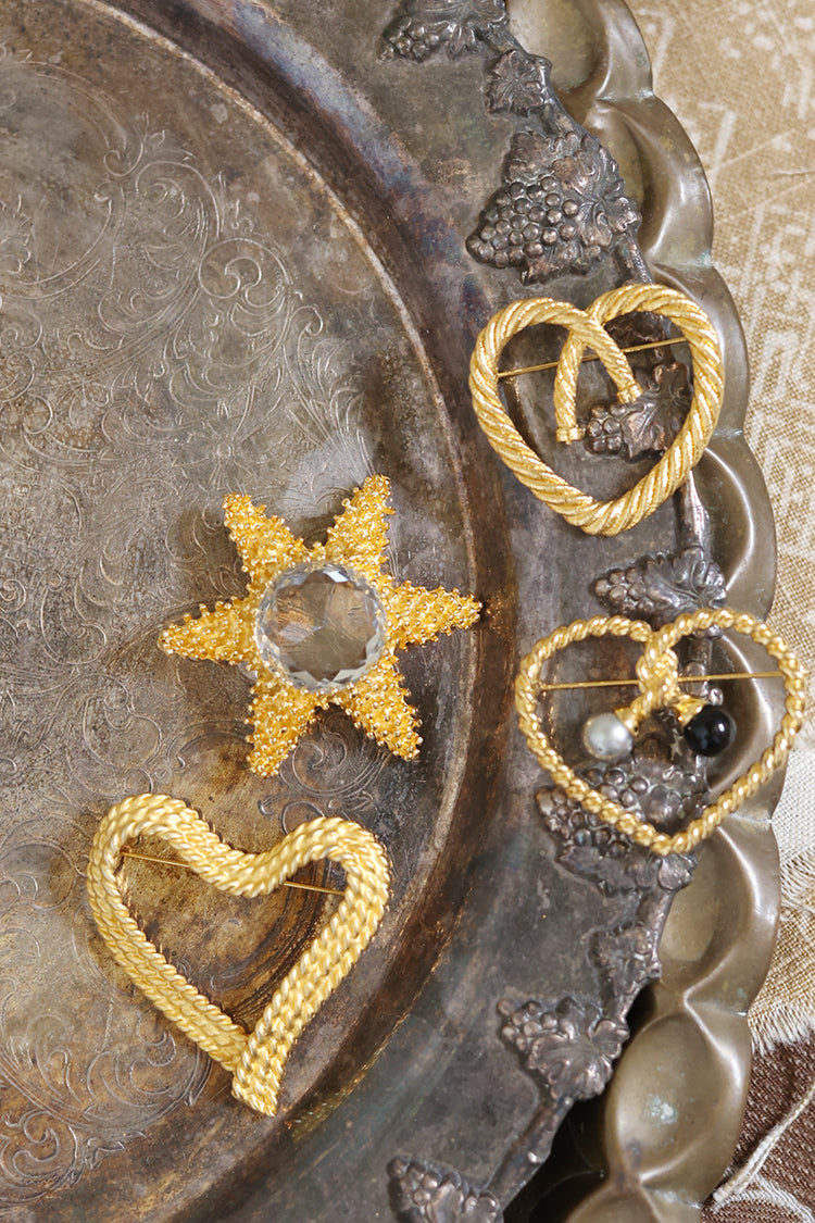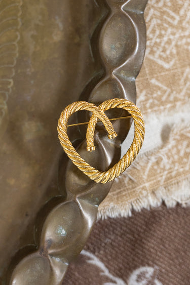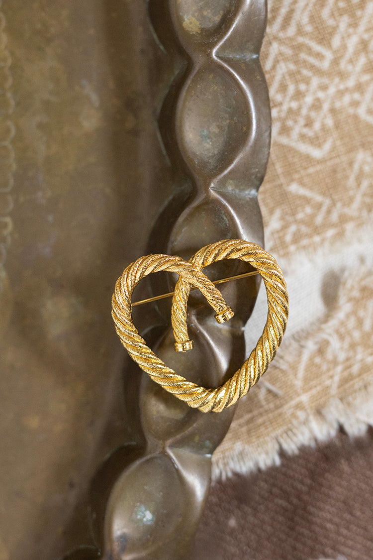 This striking vintage heart brooch brings sculptural elegance to any look. Crafted in rich gold-tone metal, the design features intertwined rope detailing that forms a bold, dimensional heart with Western vibes. Its timeless motif and substantial presence make it a versatile accessory, ideal for styling on a tailored jacket, cozy knit, or silk scarf. Whether worn as a romantic accent or a statement piece, this brooch is a beautiful addition for lovers of classic, timeless design.