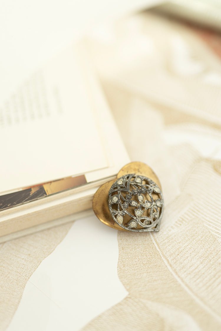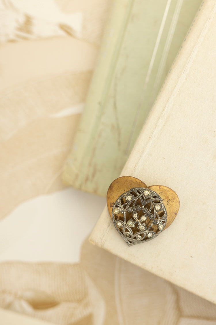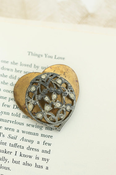 Swoon! This beautiful layered heart brooch is stunning with its aged gold, old silver and tiny bling stone mix. Pin this gem on anything and your outfit will be instantly elevated.