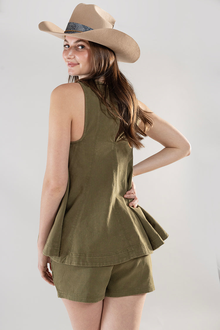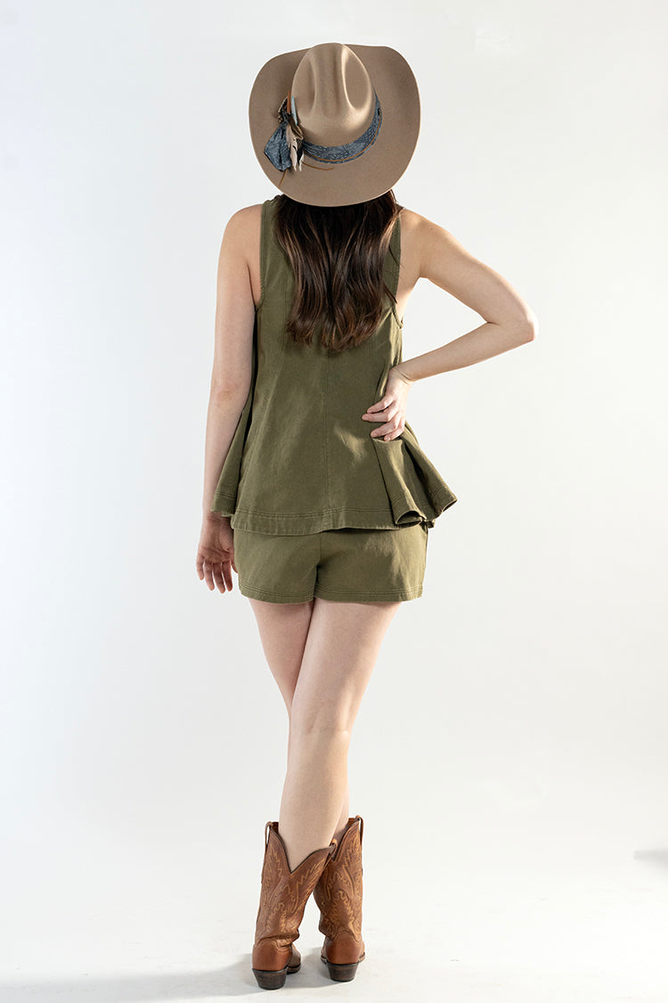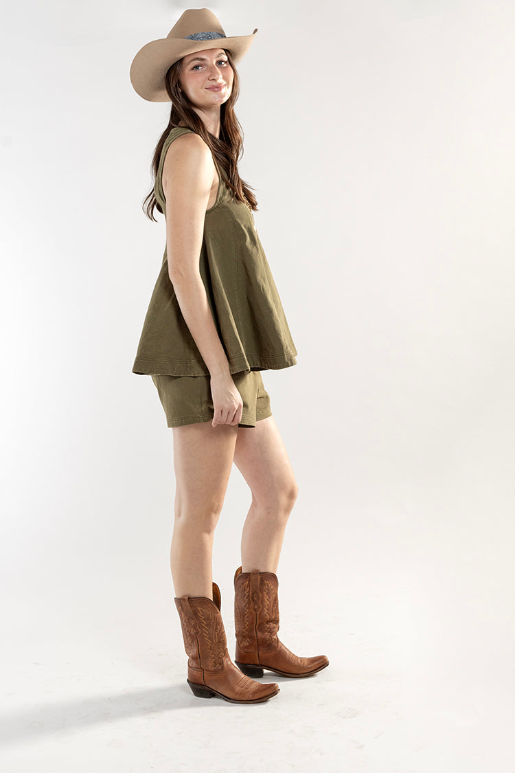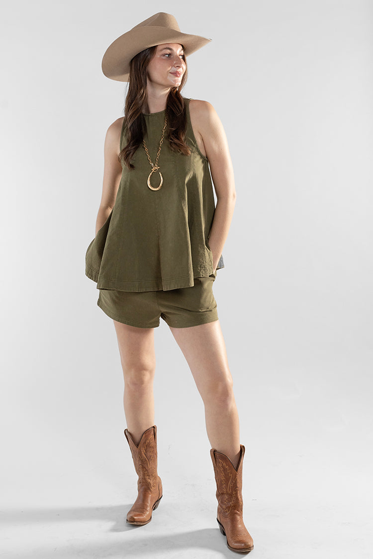 Easygoing and effortlessly stylish, these relaxed shorts blend comfort with a modern, laid-back feel. Crafted in a soft, denim-inspired fabric, they feature an elastic waistband and an easy silhouette that offers a flattering, comfortable fit. The clean, minimal design makes them perfect for pairing with the matching top for a complete set or styling separately with your favorite everyday basics.