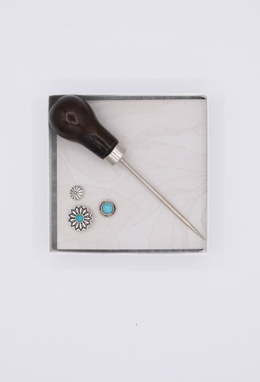 Take your hat game to the next level with our custom hat pin kit inspired by Flea Style's beautiful hat bars. This kit features an awl piercing tool and three classic western silver and turquoise pins in various sizes to easily add cowgirl vibes to the brim or crown of a hat.