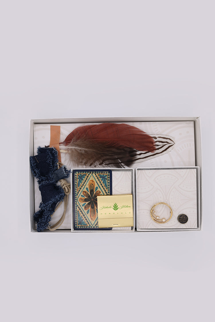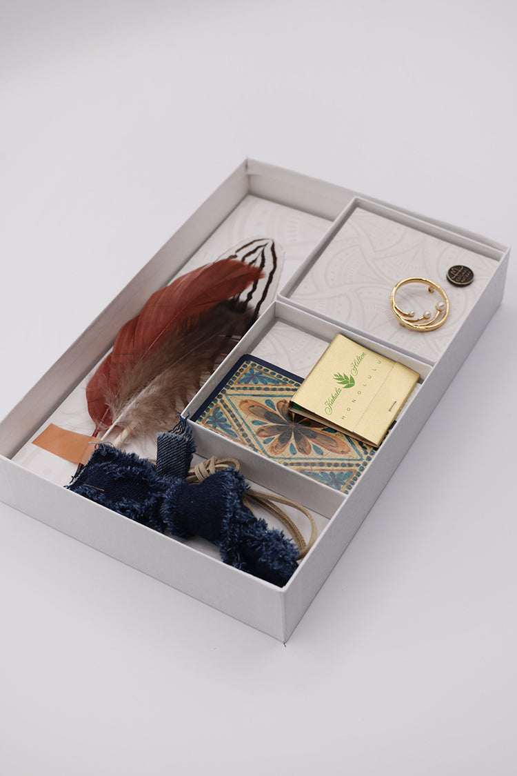 The Western kit channels classic cowboy vibes with earthy hues and Americana motifs. A classic round gold brooch with simple pearls balances the striking Southwestern playing card in jewel tone hues.