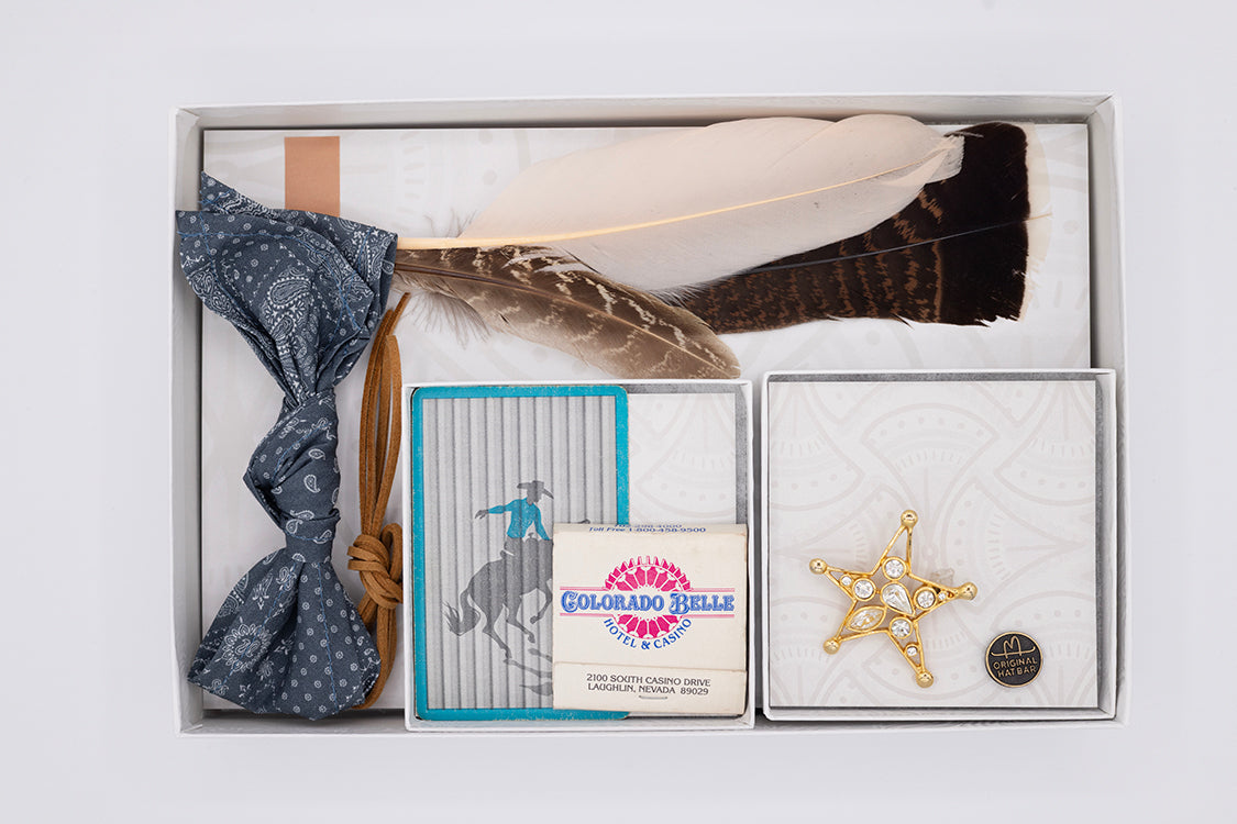 - Includes feathers, hatbands, a playing card, matchbook, vintage brooch and Original Hat Bar bronze pin